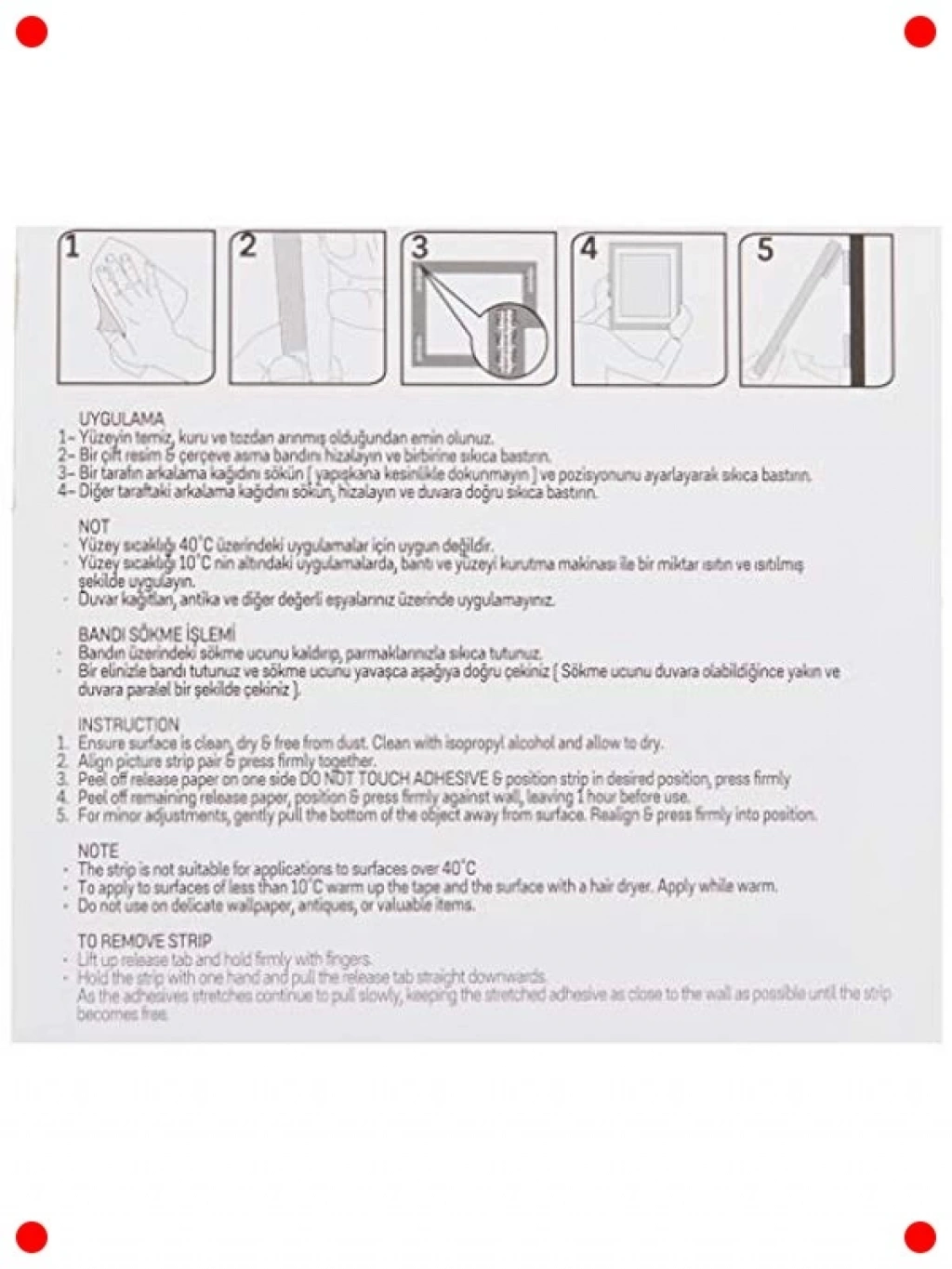 Duvarlarınızı delmeden resim çerçevelerinizi veya hafif dekoratif objelerinizi asmak için ideal olan bu 4'lü cırt bant seti, pratik ve güçlü bir çözüm sunar. Yenilikçi yapışkan teknolojisi sayesinde yüzeylere sıkıca tutunur ve düşme endişesi olmadan eşyalarınızı güvenle sabitler. Uygulaması son derece kolaydır: sadece yapıştırın, bastırın ve asın. Sökülmek istendiğinde duvarda leke veya hasar bırakmadan kolayca çıkarılabilir. Yeniden konumlandırılabilir özelliği, düzenlemeler yaparken size esneklik sağlar. İster evinizde ister ofisinizde, duvarlarınızı kişiselleştirmek ve anılarınızı sergilemek için pratik bir seçenektir. Çerçevelerinizi, tablolarınızı veya hafif panolarınızı kolayca asın ve yaşam alanınıza şıklık katın.