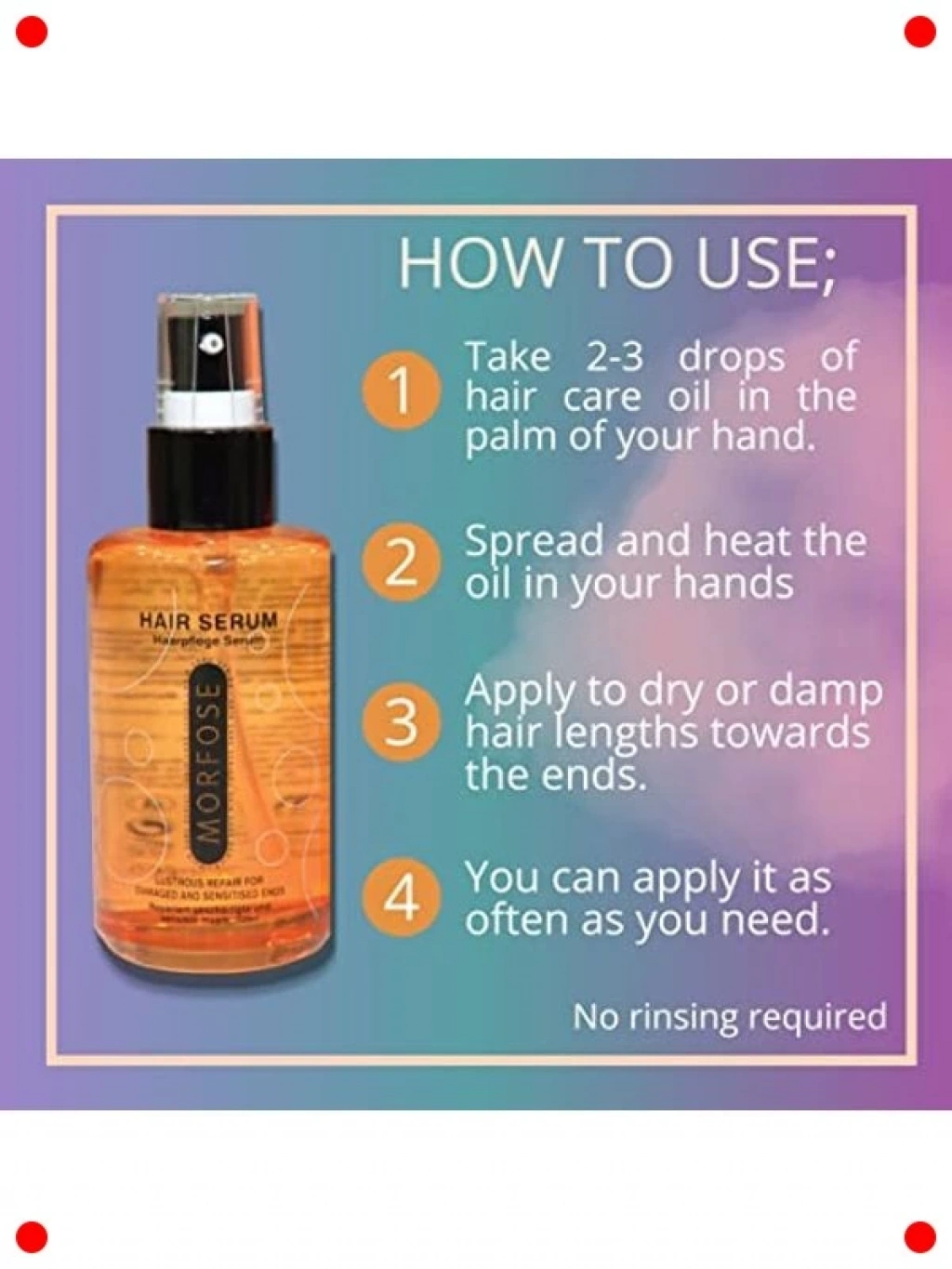 Saçlarınıza ihtiyaç duyduğu parlaklığı, yumuşaklığı ve korumayı sağlayan bu etkili saç bakım serumu, günlük rutininizin vazgeçilmezi olacak. Saç tellerini nemlendirerek elektriklenmeyi ve kabarmayı kontrol altına alır. Isı şekillendiricilerin zararlı etkilerine karşı koruma kalkanı oluşturur. Saçların daha kolay taranmasını sağlar ve kırılma riskini azaltır. Hafif formülü saçları ağırlaştırmaz, yağlı bir his bırakmaz. Tüm saç tipleri için uygun olan bu serum ile cansız saçlarınıza yeniden hayat verin, ipeksi bir dokunuş ve göz alıcı bir parlaklık kazandırın.