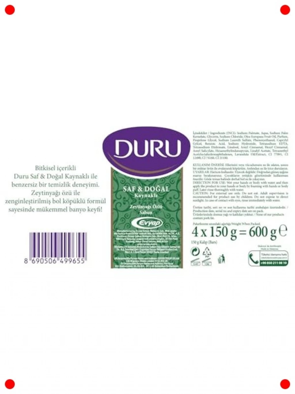 Cildinizi nazikçe temizlerken doğal yollarla besleyen saf zeytinyağı sabunumuzla tanışın. Geleneksel yöntemlerle üretilen bu doğal sabun, cildinize ihtiyaç duyduğu nemi sağlarken yumuşak ve pürüzsüz bir his bırakır. Katkı maddesi içermeyen saf formülü sayesinde tüm cilt tipleri için uygundur, hassas ciltlerde bile güvenle kullanılabilir. Cildinizi kurutmadan temizleyen bu sabun, doğal içeriği sayesinde cildin bariyerini korumaya yardımcı olur. Her biri 150 gram olan 4'lü paketiyle uzun süreli kullanım sunar. Doğallığın ferahlatıcı dokunuşunu cildinizde hissedin.