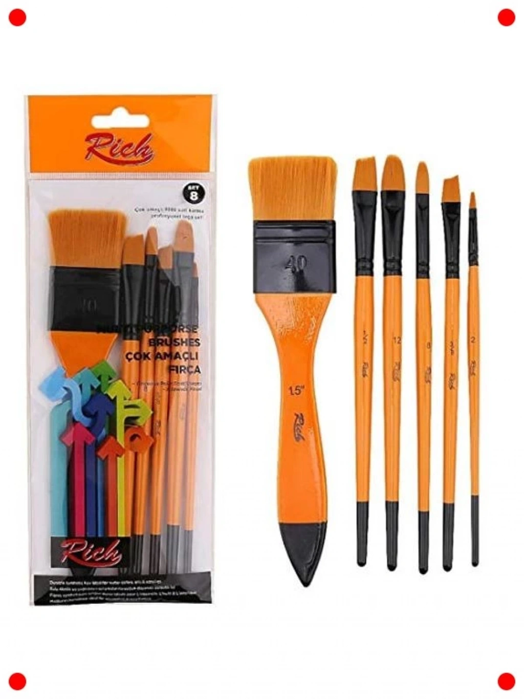 Sanatsal ifadelerinizi gerçeğe dönüştürmek için ihtiyaç duyduğunuz her şeyi sunan bu 6'lı fırça seti ile tanışın! Farklı boyut ve şekillerdeki fırçalar, yağlı boya, akrilik, sulu boya ve guaj gibi çeşitli boyama teknikleri için idealdir. Detaylı çalışmalardan geniş alanları boyamaya kadar her türlü sanatsal ihtiyacınızı karşılar. Ergonomik sapları sayesinde rahat bir tutuş sunar ve uzun süreli kullanımlarda bile yorgunluk hissini azaltır. Yüksek kaliteli sentetik kılları, boyayı eşit şekilde dağıtır ve kolay temizlenebilir özelliktedir. Hem amatörler hem de profesyonel sanatçılar için vazgeçilmez bir settir.