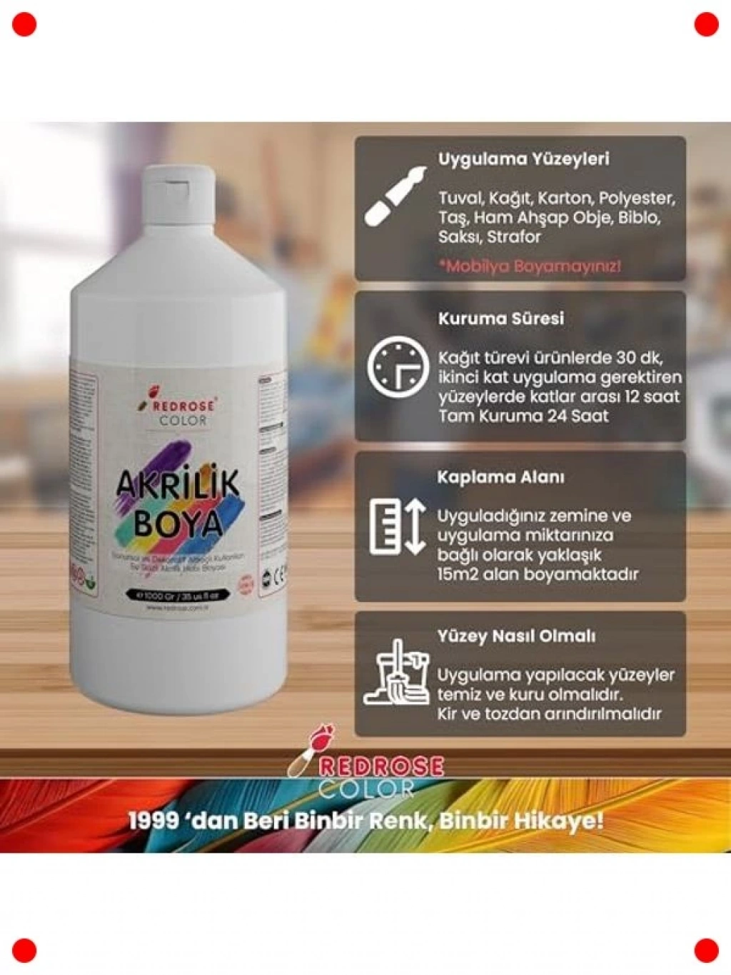 Sanatsal projeleriniz için yüksek kaliteli, yoğun pigmentli beyaz akrilik boya. 1000 gramlık büyük paketiyle geniş yüzeylerde rahatça ve bol miktarda kullanım imkanı sunar. Su bazlı formülü sayesinde kolayca karışır, uygulanır ve fırçalarınız kolayca temizlenir. Hızlı kuruma özelliği, projelerinizin daha çabuk tamamlanmasına olanak tanır. Canlı ve kalıcı renkler sunarak sanat eserlerinizin uzun süre ilk günkü gibi kalmasını sağlar. Tuval, ahşap, kağıt, metal ve birçok farklı yüzey için uygundur. Profesyonel sanatçılar, öğrenciler ve hobi sahipleri için ideal bir seçimdir. Sanatsal ifadenizi zenginleştirecek temel ve vazgeçilmez bir malzemedir.