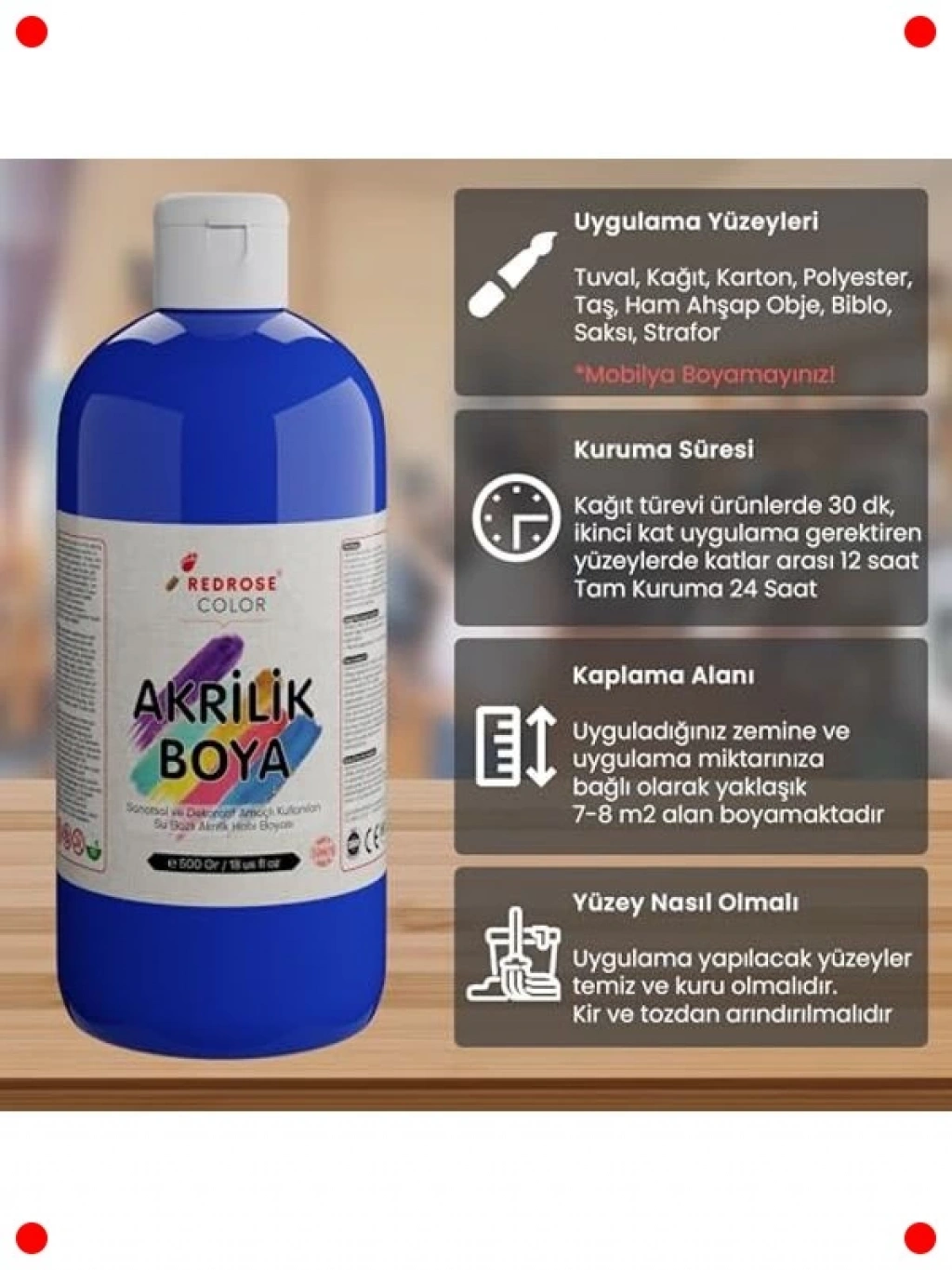 Sanat projelerinize derinlik ve canlılık katacak bu 500 gramlık mavi akrilik boya, sanatçıların ve hobi tutkunlarının vazgeçilmezi olacak. Yüksek pigmentasyonlu yapısı sayesinde tek katta bile zengin ve opak bir renk elde etmenizi sağlar. Su bazlı formülü kolayca karıştırılabilir ve hızlı kuruma özelliği, katmanlı çalışmalar yaparken size zaman kazandırır. Tuval, ahşap, kağıt, taş gibi çeşitli yüzeylerde rahatlıkla kullanılabilir. Toksik olmayan içeriği ile güvenli bir kullanım sunar. Geniş hacmi sayesinde uzun süreli projeleriniz için idealdir. Hem yeni başlayanlar hem de deneyimli sanatçılar için mükemmel bir seçimdir, yaratıcılığınızı serbest bırakın.