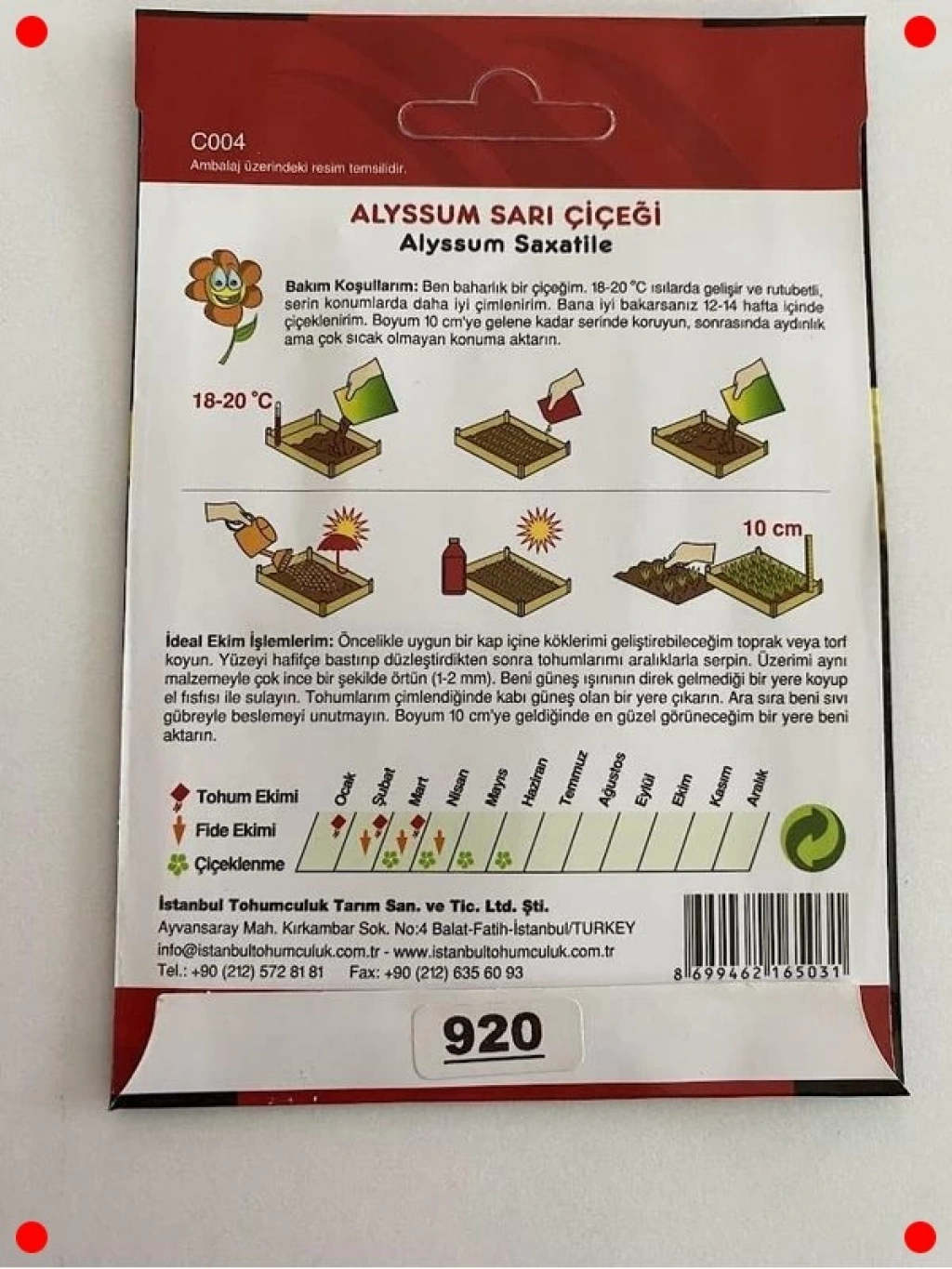 Bahçenizin topraklarını altın bir halıyla örtmek ister misiniz? Bu 250 adetlik sarı alyssum tohum paketi, bahçenizi veya saksılarınızı tatlı kokulu, parlak sarı çiçeklerle dolduracak. Yer örtücü olarak mükemmel olan alyssum, kısa boyu ve yoğun çiçeklenmesiyle bordürlerde, kaya bahçelerinde ve saksı kenarlarında harikalar yaratır. Küçük, narin çiçekleri, toprağı tamamen kaplayarak göz alıcı bir renk ve doku sağlar. Bakımı oldukça kolaydır, bol güneş ışığı ve düzenli sulama ile sağlıklı bir şekilde büyür. Arıları ve diğer faydalı böcekleri çeken bu bitki, bahçenizin ekosistemine de katkıda bulunur. Bahçenize neşeli bir dokunuş katın.