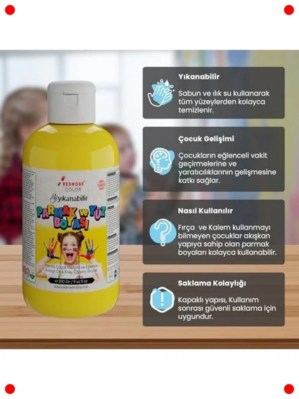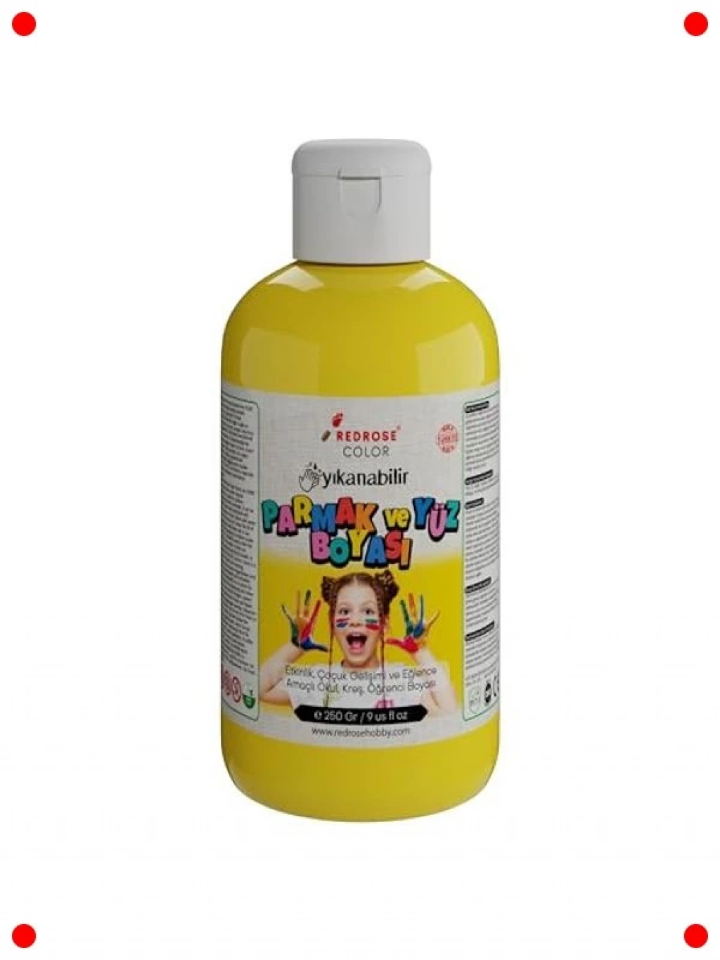 Minik sanatçıların yaratıcılıklarını özgürce ifade etmeleri için tasarlanmış bu canlı sarı parmak boyası ile eğlence dolu sanat zamanları sizi bekliyor! Güvenli ve toksik olmayan formülü sayesinde çocuklarınızın cildine zarar vermez ve kolayca temizlenebilir. Parlak sarı rengi, çocukların görsel algısını ve sanatsal ifadesini zenginleştirirken, dokunsal deneyimiyle duyusal gelişimlerine katkıda bulunur. İnce motor becerilerini ve el-göz koordinasyonunu geliştirmek için idealdir. Evde veya okulda erken dönem sanat aktiviteleri için mükemmel olan 250 gramlık büyük boyutuyla uzun süreli eğlence sunar. Çocukların gelişimini destekleyen harika bir ürün.