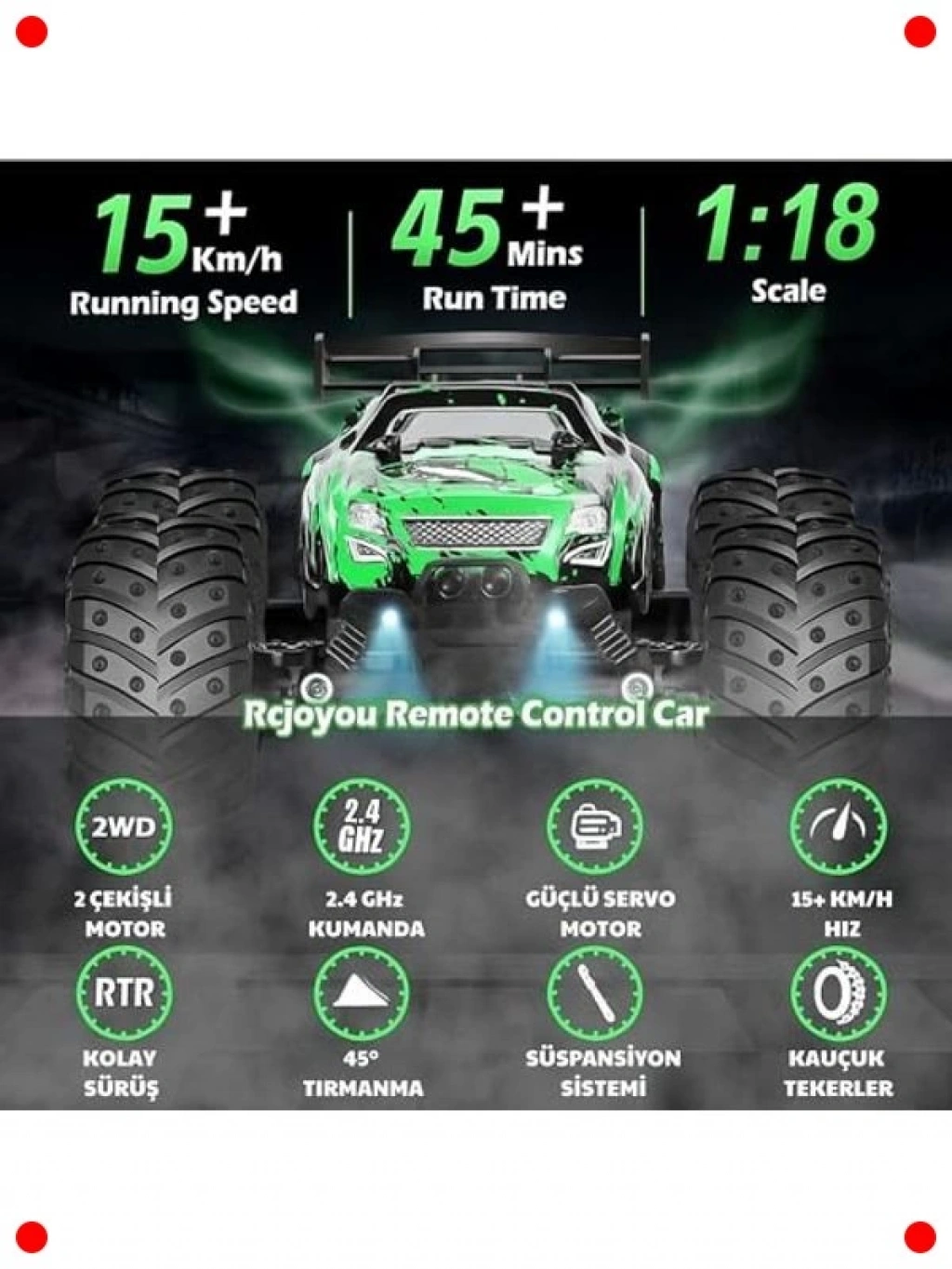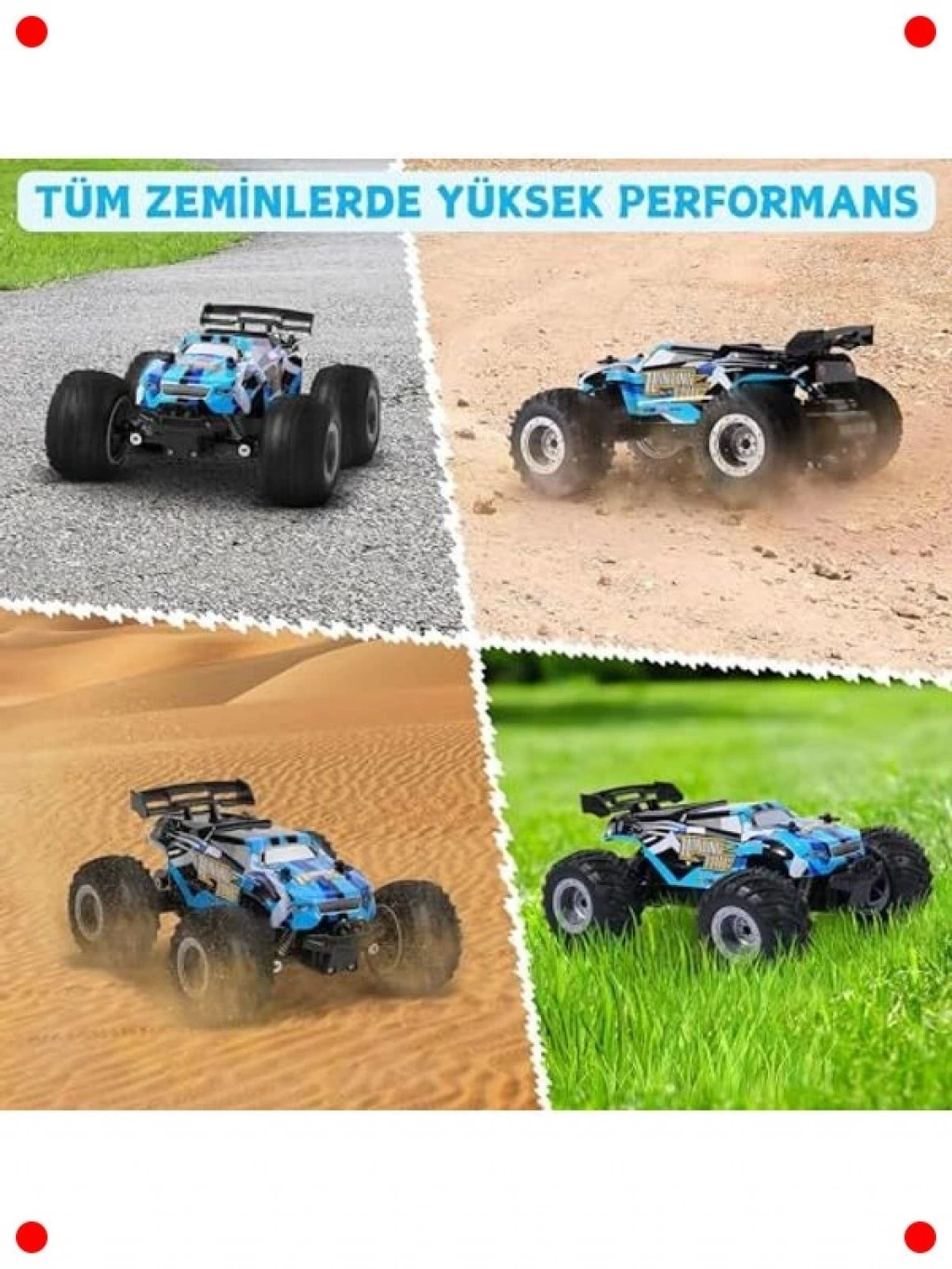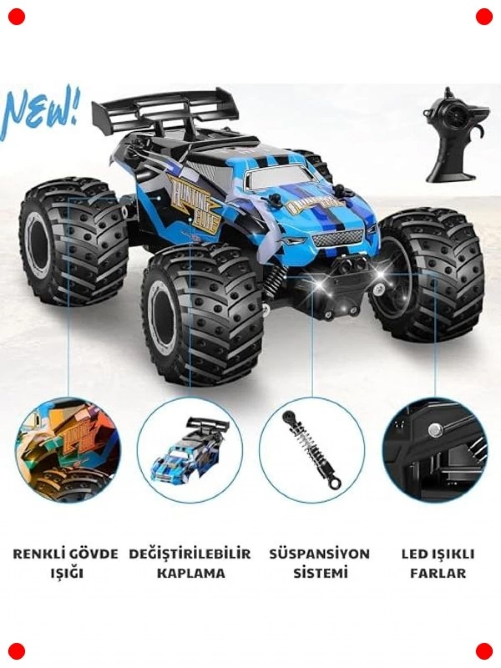 Adrenalin dolu yarışlar ve heyecan verici drift deneyimleri için tasarlanmış bu uzaktan kumandalı off-road araba ile aksiyonun tadını çıkarın. 2.4 Ghz frekansıyla kesintisiz kontrol imkanı sunan bu araç, 15 km/sa hıza ulaşabilir ve çarpıcı drift hareketleri yapabilir. Dahili LED ışıkları, özellikle gece oyunlarında görsel bir şölen sunar. 1200 mAh bataryası sayesinde tek şarjla 45 dakikaya kadar kesintisiz sürüş keyfi yaşayabilirsiniz. Sağlam ve dayanıklı yapısı, en zorlu off-road koşullarına bile dayanıklıdır. Çocukların el-göz koordinasyonunu, reflekslerini ve problem çözme becerilerini geliştirirken, onlara unutulmaz maceralar yaşatır. Hem iç hem de dış mekan oyunları için mükemmel bir seçenektir. Hız, kontrol ve eğlenceyi bir arada sunan bu oyuncak, küçük yarışçıların favorisi olacak. Mavi rengiyle göz alıcı bir tasarıma sahiptir.