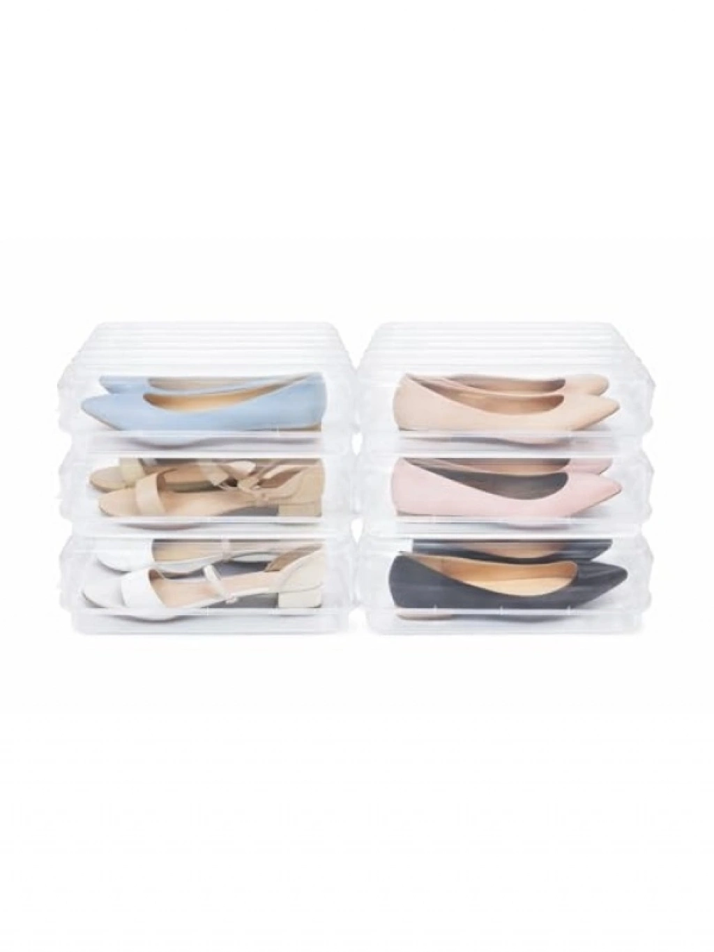 Bu set, bir çift kadın ayakkabısını saklayabilen şeffaf kutulardan oluşmaktadır. Hava sirkülasyonunu sağlayan delikler, ayakkabılarınızı korur. İstiflenebilir tasarımı sayesinde alan tasarrufu yapabilir, farklı alanlarda kolayca düzenleyebilirsiniz. Ayrıca çorap, iç çamaşırı veya oyuncak gibi diğer eşyaları saklamak için de kullanılabilir.