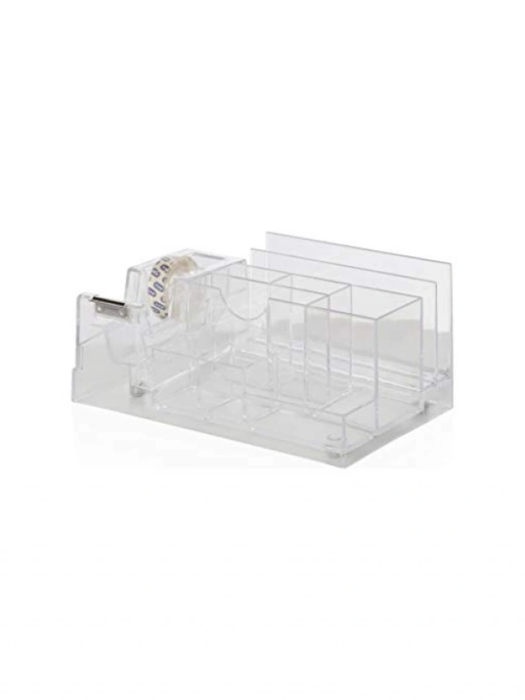 Kullanışlı ve şık tasarıma sahip bant kesicili masa organizeri, ofis malzemelerinizi düzenli bir şekilde saklamanıza yardımcı olur. Kalem, makas, ataş gibi malzemelerinizi ayrı bölmelerde muhafaza ederek çalışma alanınızı düzenler. Şeffaf yapısı ile içindeki malzemeleri kolayca görmenizi sağlar. Evinizde veya ofisinizde düzen sağlamak için mükemmel bir tercihtir.