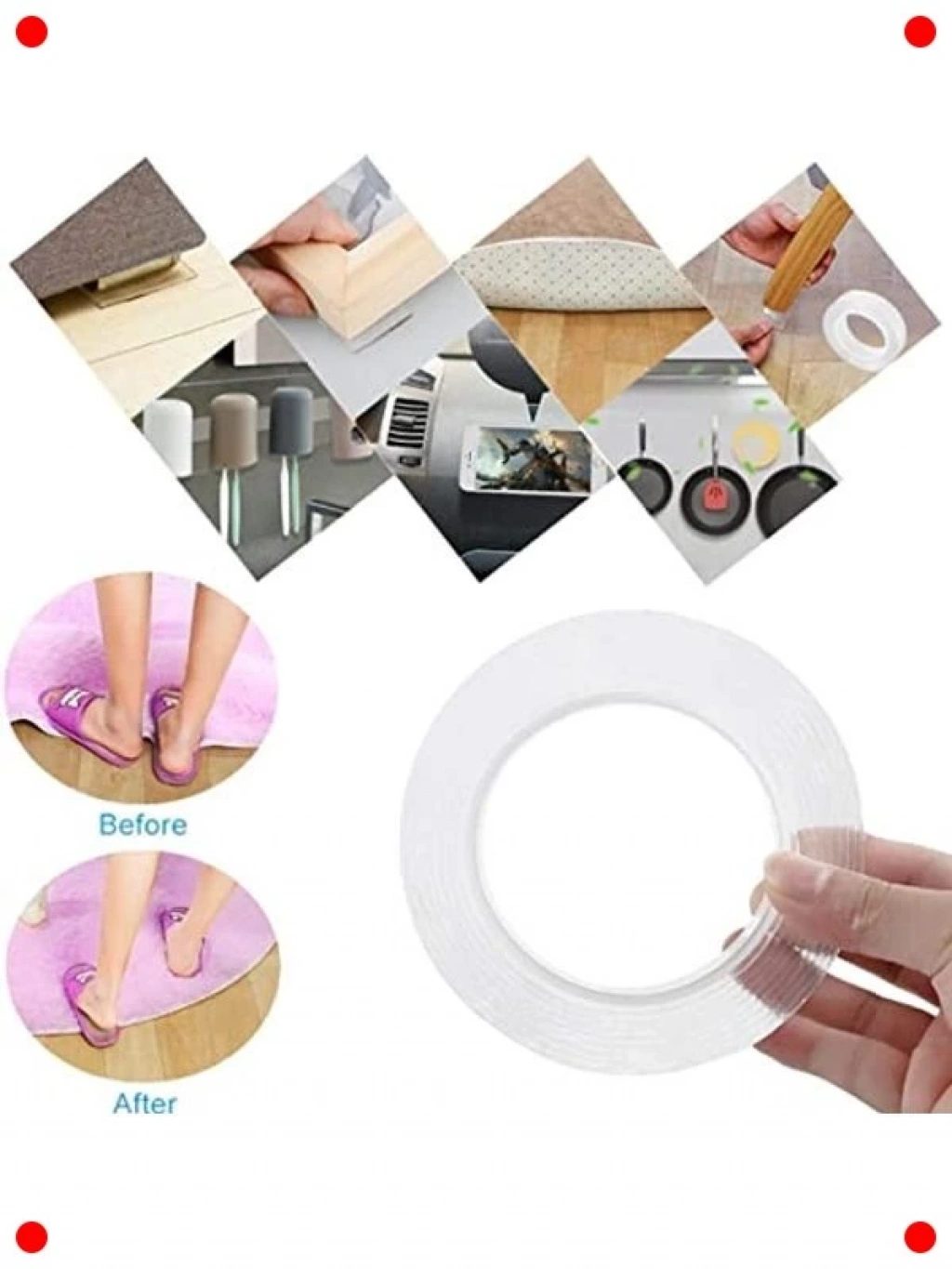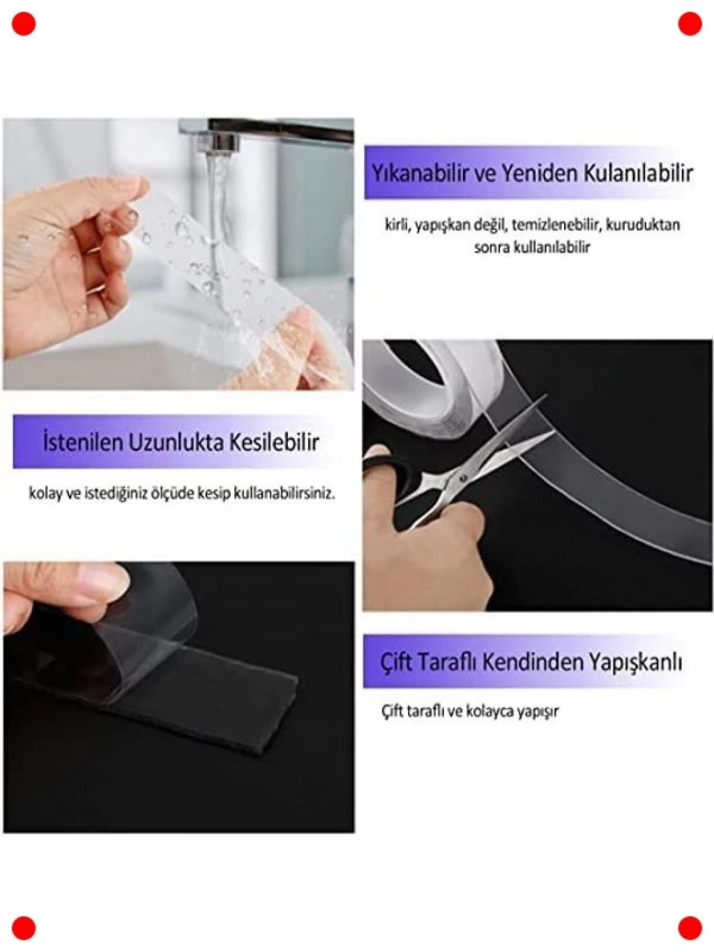 Yeniden kullanılabilir, ekstra güçlü ve şeffaf çift taraflı nano bant ile eşyalarınızı sabitlemek artık çok kolay! 3 metre uzunluğundaki bu bant, herhangi bir yüzeye zarar vermeden güçlü bir tutuş sağlar ve iz bırakmadan çıkarılabilir. Silikon jel yapısı sayesinde kolayca yıkanabilir ve kuruduktan sonra yapışkanlığını geri kazanarak defalarca kullanılabilir. Halıları sabitlemekten, fotoğrafları duvara asmaya, kabloları düzenlemekten, mutfak eşyalarını sabitlemeye kadar birçok alanda pratik bir çözüm sunar. Ev, ofis, araba veya banyo gibi birçok farklı ortamda güvenle kullanabilirsiniz.