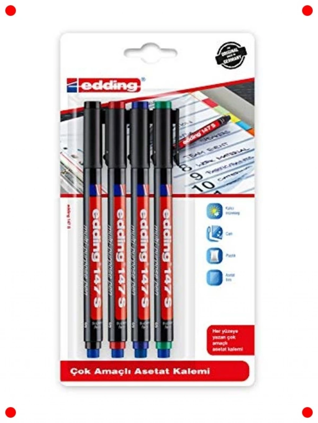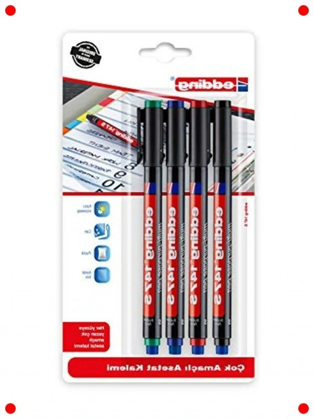 Sunumlarınızı ve notlarınızı renklendirmek için ideal olan bu 4'lü asetat kalem seti ile yaratıcılığınızı serbest bırakın. Siyah, kırmızı, mavi ve yeşil renk seçenekleriyle her türlü görsel materyal üzerinde dikkat çekici yazılar yazabilirsiniz. 0.3 mm ince ucu sayesinde detaylı çizimler ve hassas notlar için mükemmeldir. Entegre silgisi, yaptığınız hataları kolayca düzeltmenizi sağlar, böylece her zaman temiz ve düzenli bir çalışma sunabilirsiniz. Asetat, film ve laminasyon gibi pürüzsüz yüzeyler üzerinde kalıcı iz bırakmadan yazma imkanı sunar. Okulda, ofiste veya evde projektör ve sunum hazırlıklarınız için vazgeçilmez bir yardımcıdır.