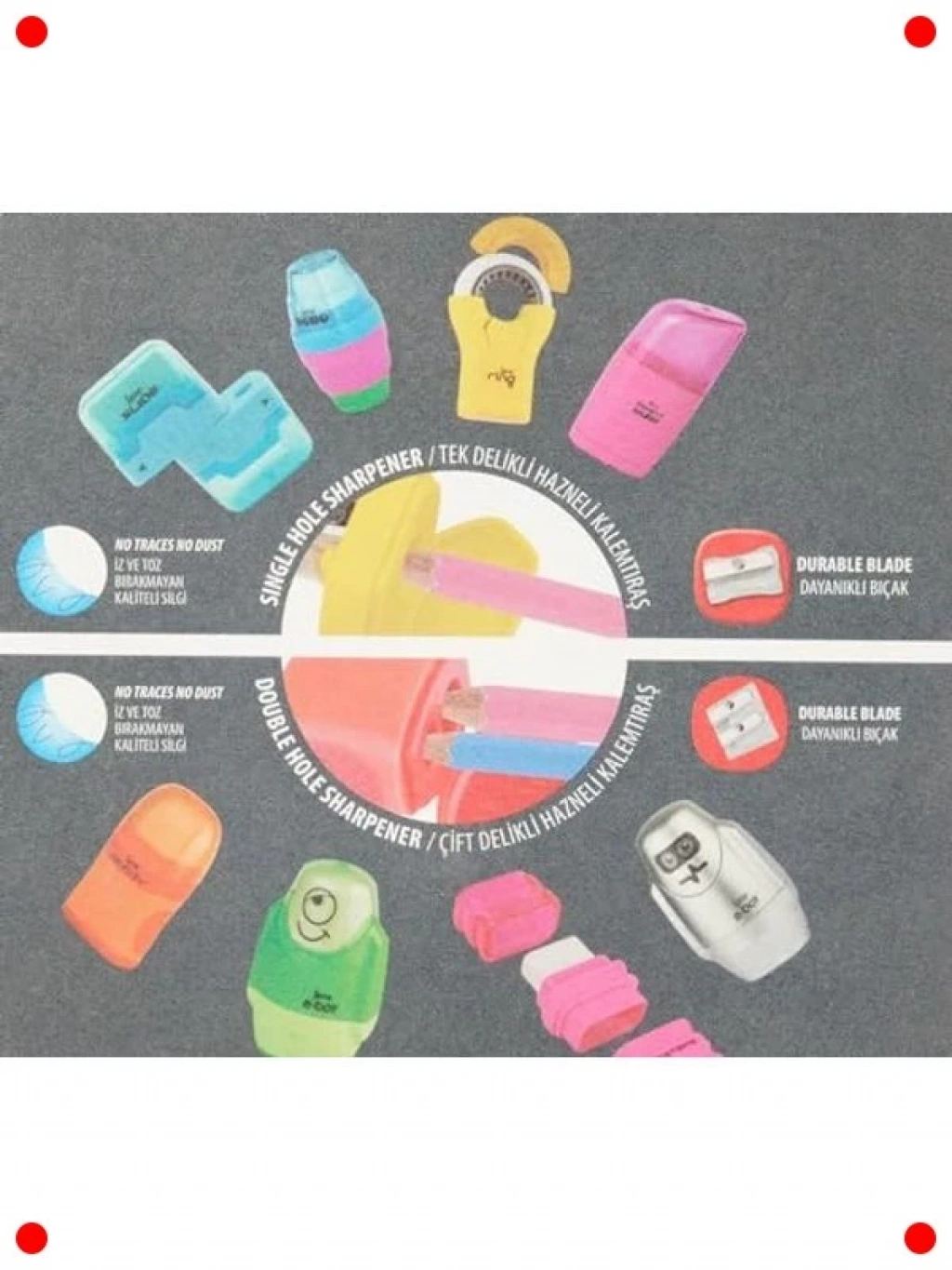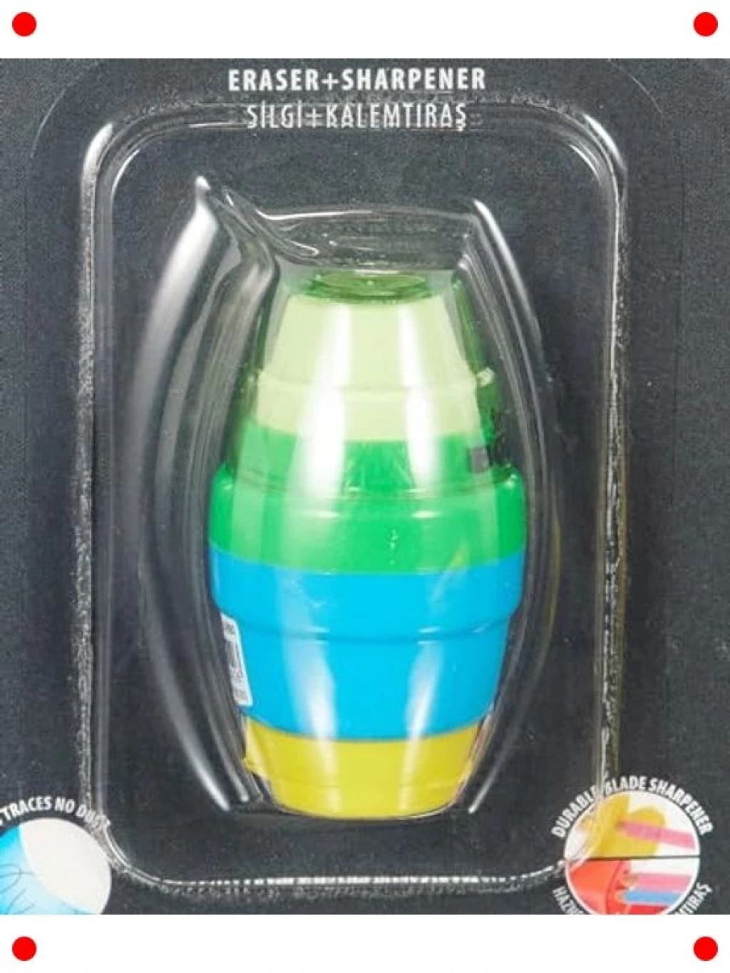 Bu pratik ve şık silgili kalemtıraş seti ile çalışma masanızda düzeni sağlayın. Yeşil, mavi ve sarı gibi canlı renk seçenekleriyle gelen bu kalemtıraşlar, hem fonksiyonel hem de estetik bir görünüm sunar. Her kalemtıraşın üzerinde bulunan entegre silgi sayesinde, yazı yazarken veya çizim yaparken hatalarınızı anında düzeltebilirsiniz. Keskin bıçakları, kalemlerinizi sorunsuz ve düzgün bir şekilde açmanızı sağlar. Okul çantaları, ofis çekmeceleri ve evdeki çalışma alanları için mükemmel bir eklentidir. Öğrenciler ve profesyoneller için ideal, iki işlevi tek bir üründe birleştiren kullanışlı bir araçtır. Çift fonksiyonlu tasarımıyla hayatınızı kolaylaştırır.