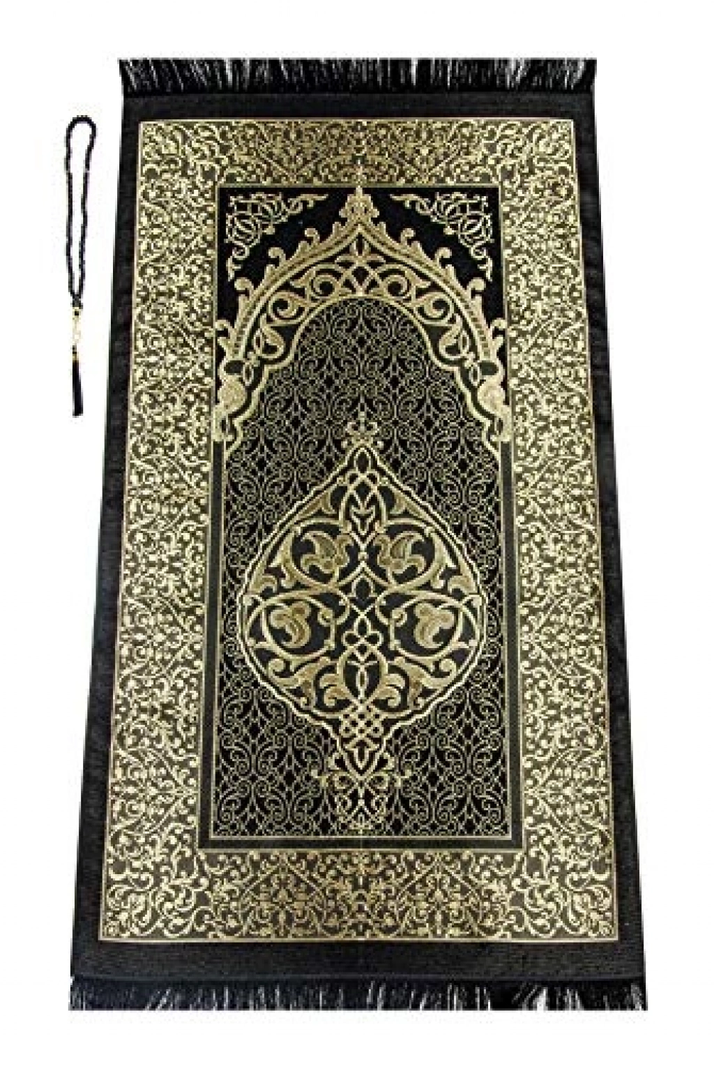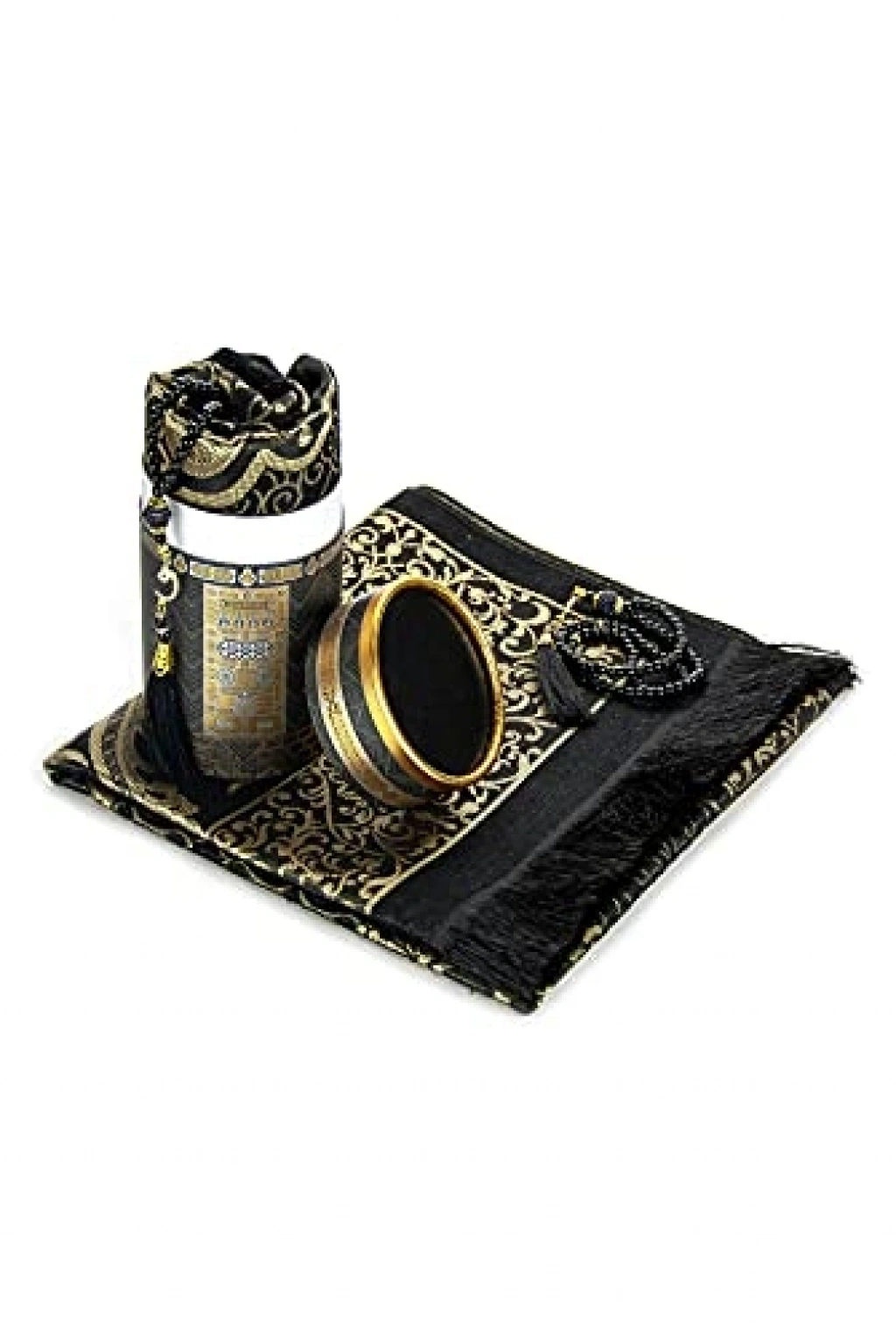 Siyah kablolu silindir kutu içerisinde yer alan tafta seccade, Kabe tasarımıyla dikkat çekmektedir. 99'lu inci tesbih ile birlikte gelir ve şık bir hediye alternatifi sunar.