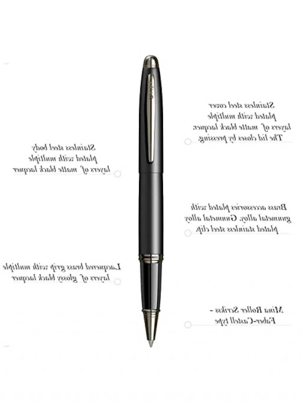 Bu siyah roller kalem, paslanmaz çelik kapak ve gövde ile uzun ömürlü kullanım sağlar. Krom kaplama klipsi ve halkası, şık bir görünüm sunar. Özel kutusunda sunulan bu kalem, profesyonel yazım deneyimi arayanlar için idealdir. Yüksek kaliteli mürekkep ile sorunsuz bir yazım sağlar. Kalem, hem ofis hem de günlük kullanım için mükemmel bir tercihtir.