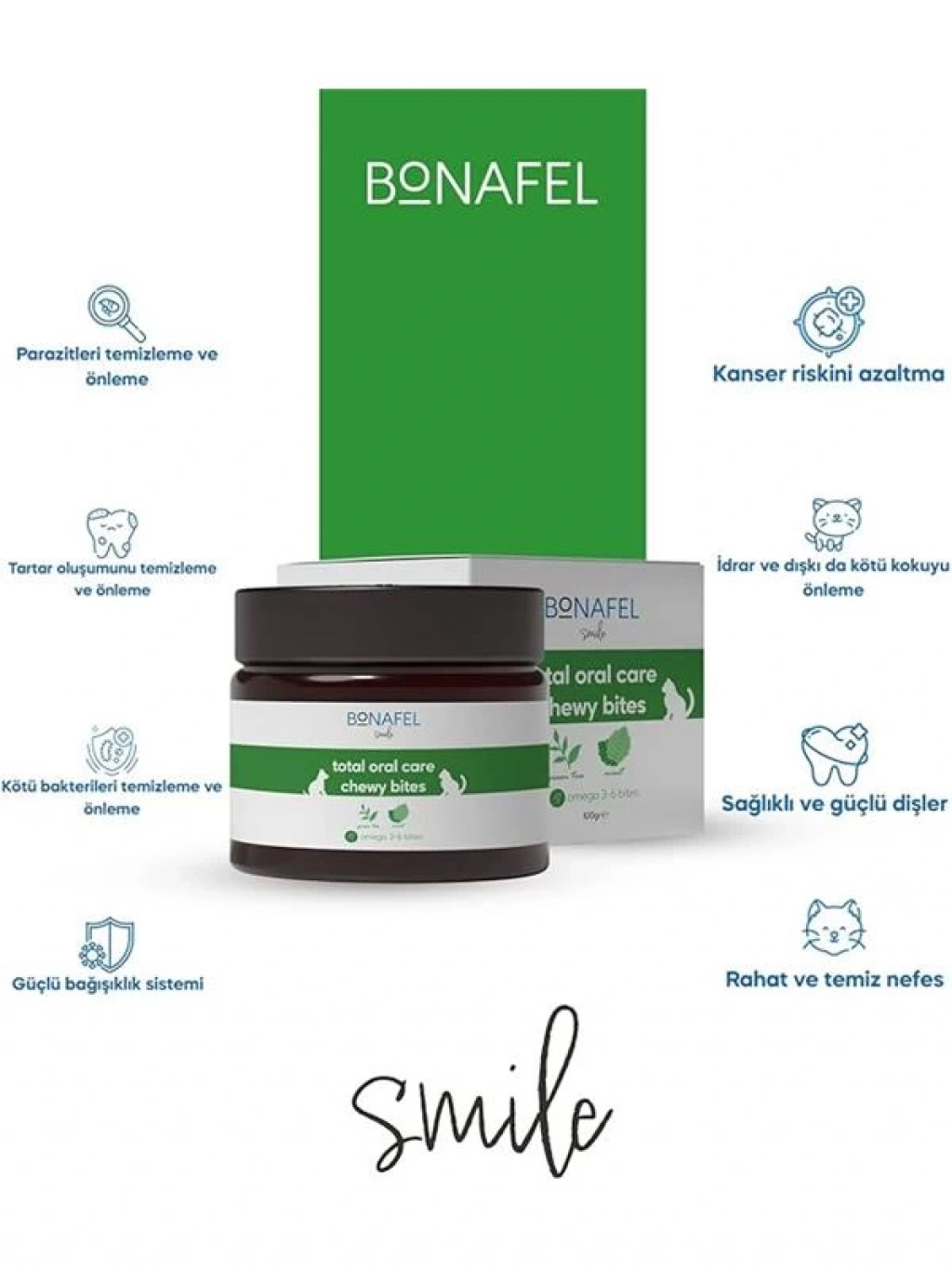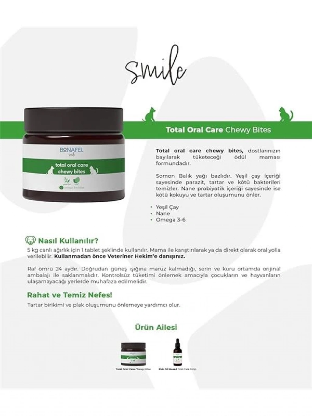 Bu ürün hakkında Total oral care chewy bites dostlarınızın bayılarak tüketeceği ödül maması formundadır Somon Balık yağı bazlıdır Yeşil çay içeriği sayesinde parazit tartar ve kötü bakterileri temizler Nane probiyotik içeriği sayesinde ise kötü kokuyu ve tartar oluşumunu önler 5 kg canlı ağırlık için 1 tablet şeklinde kullanılır Mama ile karıştırılarak ya da direkt olarak oral yolla verilebilir Kullanmadan önce Veteriner Hekime danışınız Merkezi sinir sistemini destekler Görme duyusu ve beyin gelişimini destekler Daha fazla göster