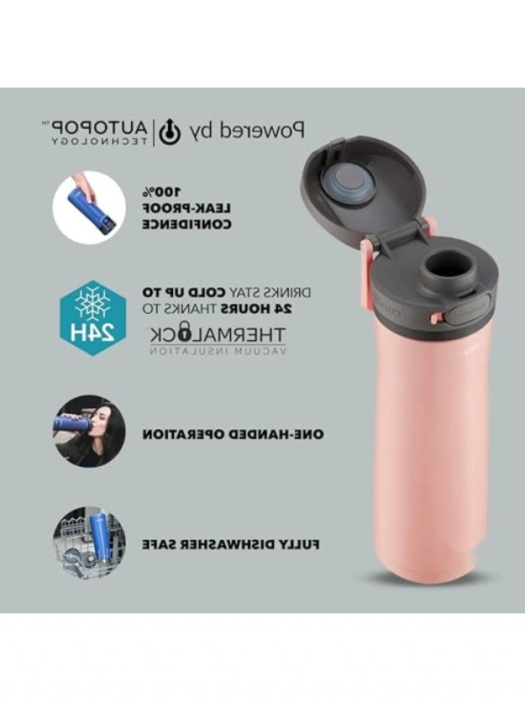 Bu 590 mL kapasiteli soğuk su termosu, çift katmanlı paslanmaz çelik yapısı ile 24 saate kadar soğuk tutma özelliğine sahiptir. Dökülmeye karşı patentli kapak sistemi, taşıma esnasında sızdırmayı engeller. Ekstra kilit düğmesi ile güvenli bir kullanım sunar. Bulaşık makinesinde yıkanabilir kapak, BPA içermeyen malzemeden üretilmiştir.
