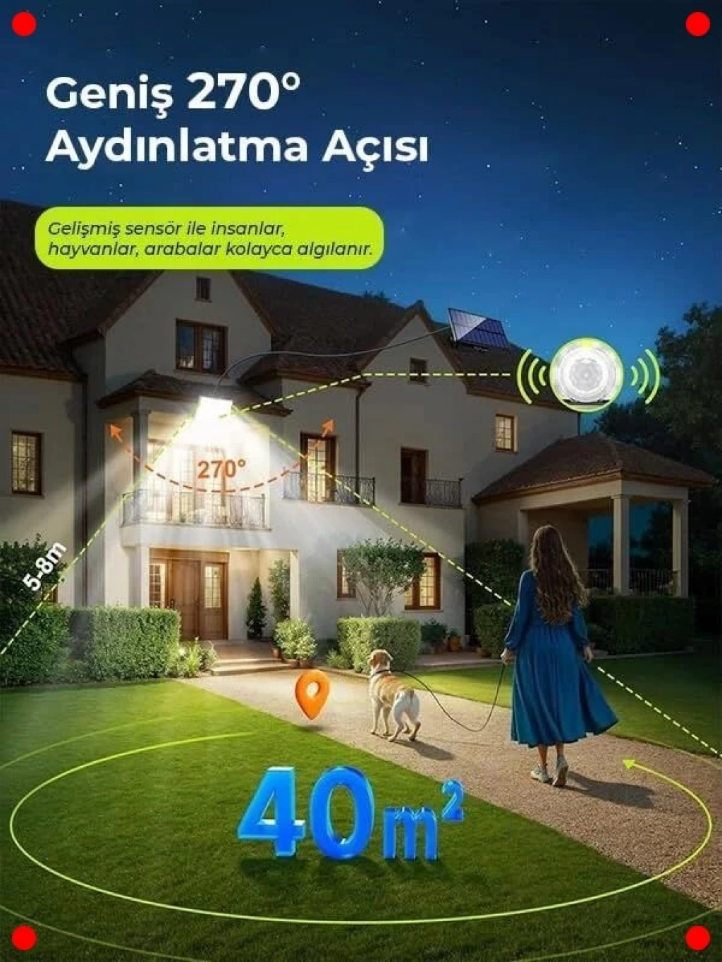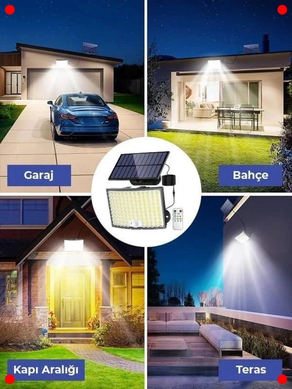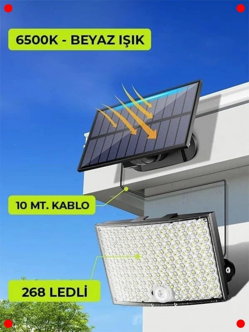 Enerji tasarruflu ve çevre dostu bu güneş enerjili dış mekan projektörü ile bahçenizi, avlunuzu veya girişinizi aydınlatın. Güneş paneli sayesinde gün içinde enerji depolar ve gece otomatik olarak devreye girer. Yüksek parlaklıktaki LED'ler geniş bir alanı etkili bir şekilde aydınlatırken, entegre hareket sensörü sayesinde sadece gerektiğinde çalışarak enerji israfını önler. IP65 su geçirmezlik derecesiyle her türlü hava koşuluna dayanıklıdır. Kablolu tasarımı sayesinde güneş panelini en uygun yere, projektörü ise aydınlatılacak alana kolayca yerleştirebilirsiniz. Kurulumu kolaydır ve ek elektrik tesisatına ihtiyaç duymaz. Hem güvenlik hem de estetik açıdan mekanlarınıza değer katar.