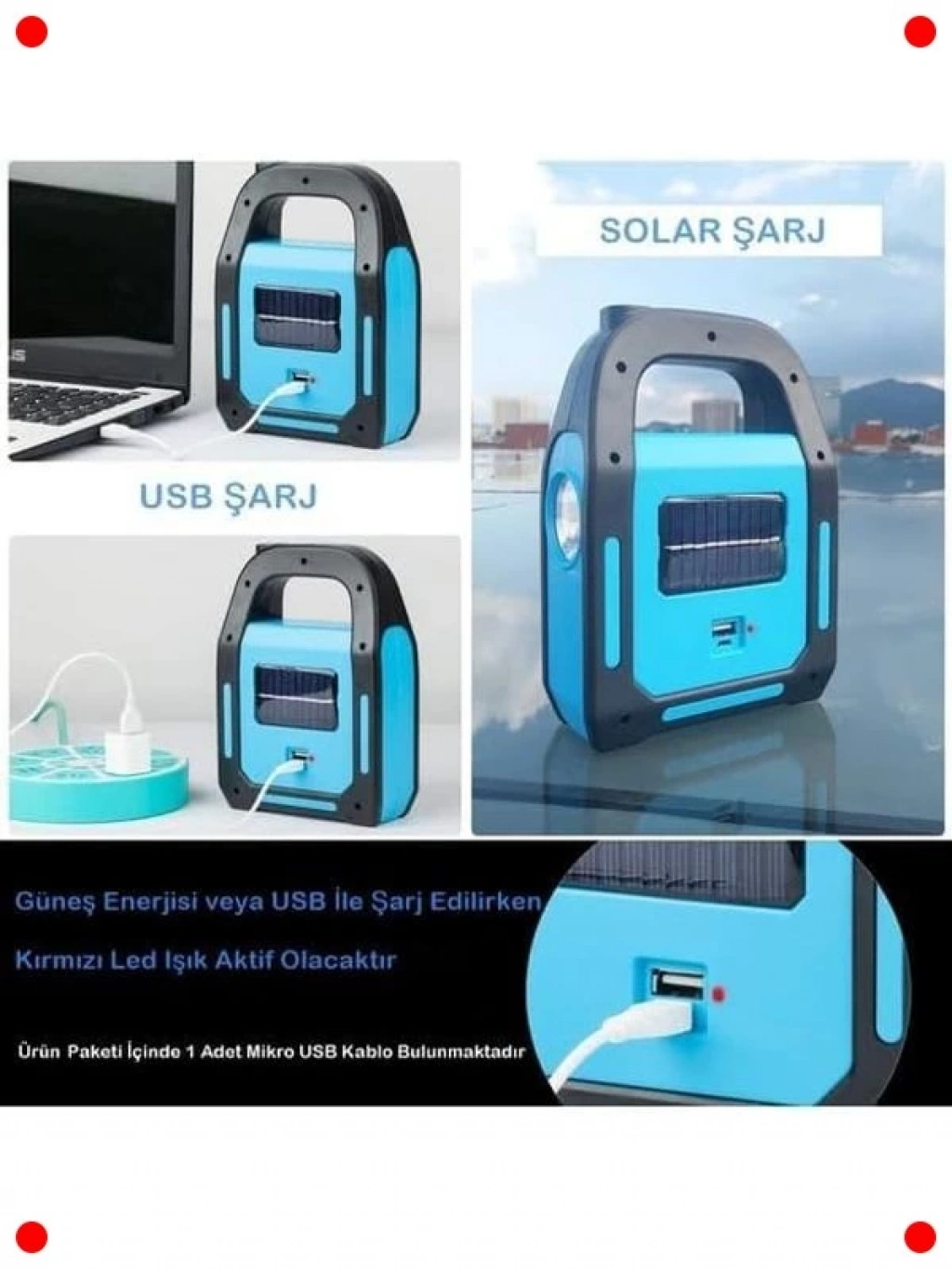 Açık hava maceralarınızda ve acil durumlarınızda yanınızdan ayırmayacağınız bu çok yönlü LED kamp feneri ve ışıldak, hem güneş enerjisiyle hem de USB kablosuyla şarj edilebilir. Parlak LED ışığı sayesinde geniş bir alanı aydınlatır, kamp alanınızda veya bahçenizde yeterli görüş sağlar. Portatif ve hafif tasarımı kolayca taşınmasını mümkün kılar. Güneş enerjisi özelliği, doğa dostu bir kullanım sunarken, USB şarj seçeneğiyle her an enerjiye erişmenizi garantiler. Hem fener hem de ışıldak olarak kullanılarak farklı aydınlatma ihtiyaçlarınıza cevap verir.