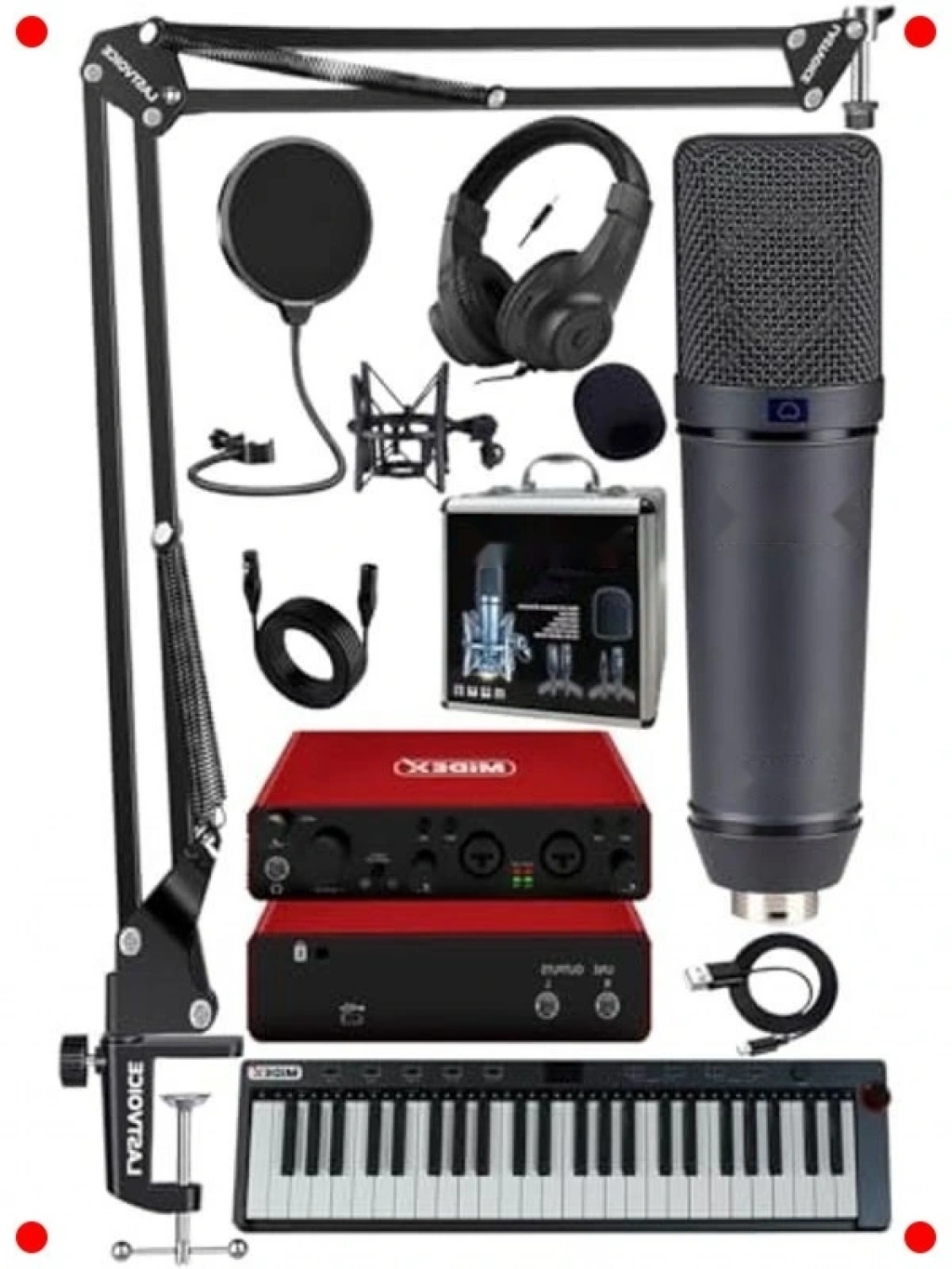 Müzik düksiyonu veya ses kaydı dünyasına adım mak isteyenler için mükemmel bir başlangıç noktası sunan stüdyo ekipmanları seti, tüm temel ihtiyaçları karşılar. Dahil olan ses kartı, enstrümanlarınızı ve vokallerinizi bilgisayarınıza yüksek kalitede kaydetmenizi sağlar. Dinamik MIDI klavye, melodiler ve aranjmanlar oluşturmak için sezgisel bir arayüz sunar. Net ses yakalama özelliğine sahip stüdyo mikrofonu ve konforlu kulaklık, kayıt sürecinizin her aşamasında size destek olur. paketle kendi müziğinizi yarmaya başlayın, podcast'lerinizi kaydedin veya seslendirme jelerinizi haya geçirin.