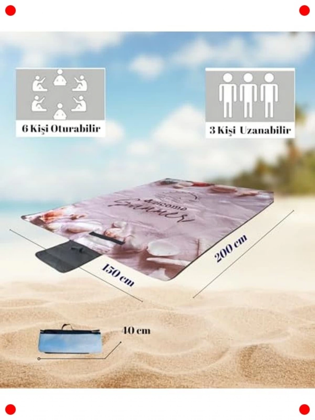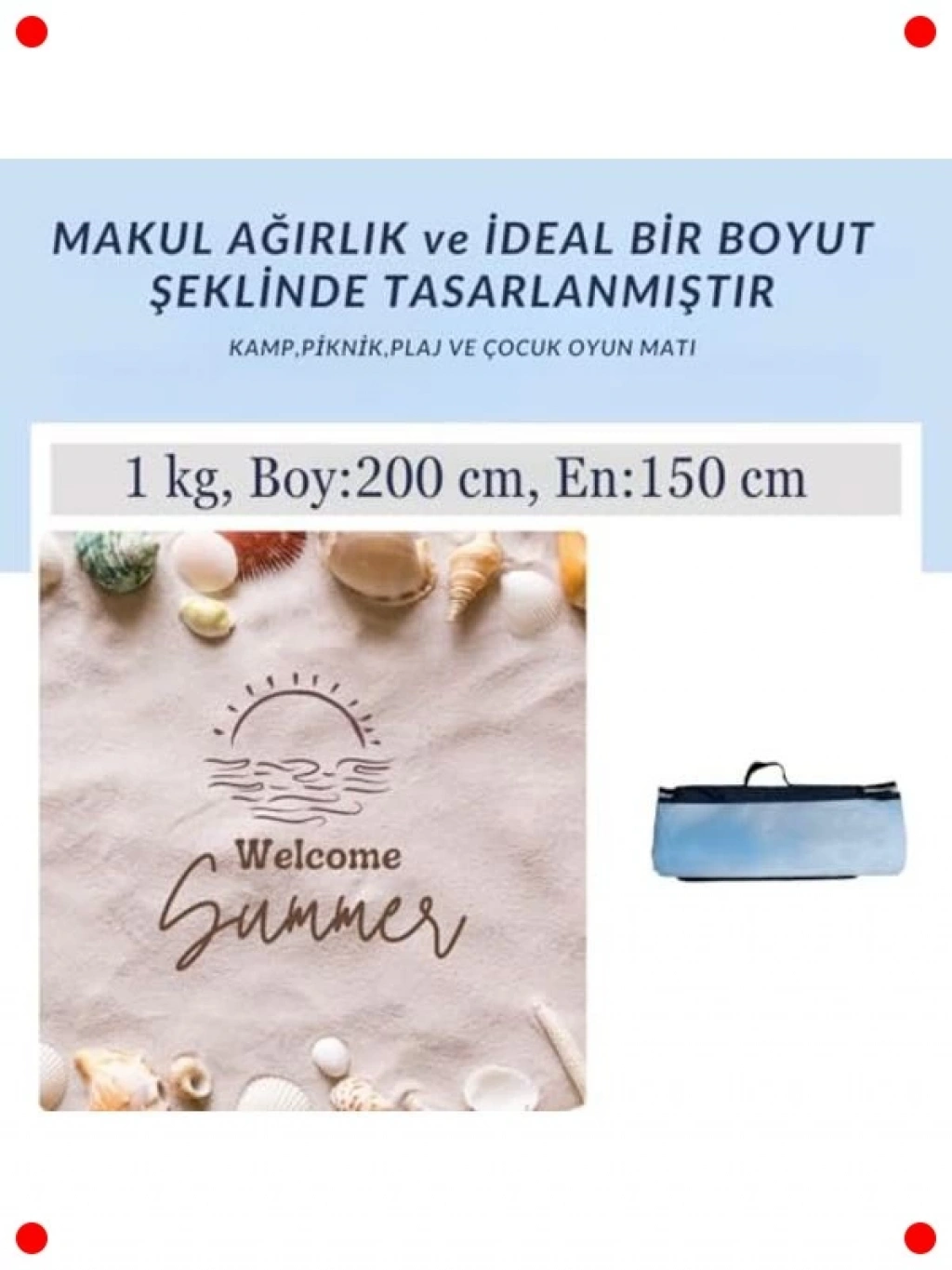 Plaj, piknik, kamp veya açık hava etkinlikleriniz için mükemmel bir arkadaş olan bu çok amaçlı örtü, su geçirmez ve kum tutmaz özellikleriyle konforunuzu artırır. Hafif ve kompakt yapısı sayesinde kolayca katlanıp taşınabilir. Özel dokusu sayesinde kumun üzerinde kalmasını engeller ve temizliği oldukça pratiktir. Deniz kabukları deseniyle estetik bir görünüm sunar, bu da onu sadece kullanışlı değil, aynı zamanda şık yapar. Dayanıklı malzemesi uzun ömürlü kullanım sağlarken, sizi nemden ve kirden korur. Ailenizle veya arkadaşlarınızla keyifli anlar geçirmek için ideal bir seçimdir.
