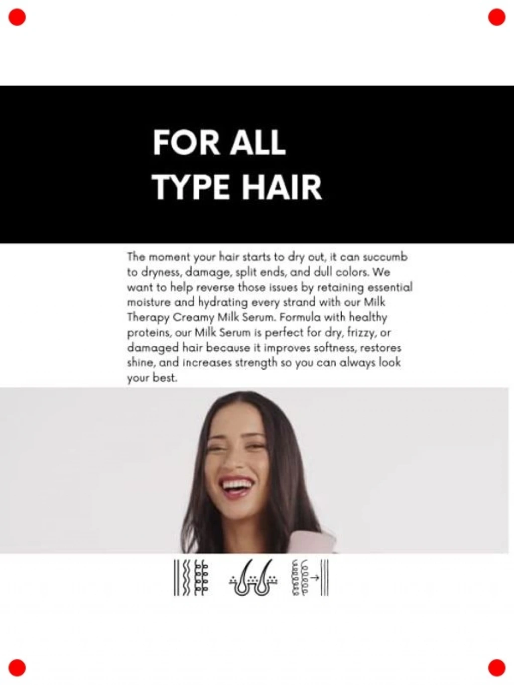 Saçlarınızı derinlemesine onaran ve güçlendiren bu süt terapisi keratin serumu ile saçlarınızda mucizevi bir değişim yaratın. Keratin içeriği sayesinde yıpranmış saç tellerini yeniden yapılandırır, kırılma ve kopmaları önler. Saçlarınıza yoğun nem ve parlaklık kazandırırken, elektriklenmeyi kontrol altına alır. Hafif yapısıyla saçlarda ağırlık yapmaz ve kolayca emilir. Isıl işlem öncesi koruma olarak da kullanılabilir. Düzenli kullanımda saçlarınızın daha pürüzsüz, güçlü ve sağlıklı görünmesini sağlar. Tüm saç tipleri için uygundur.