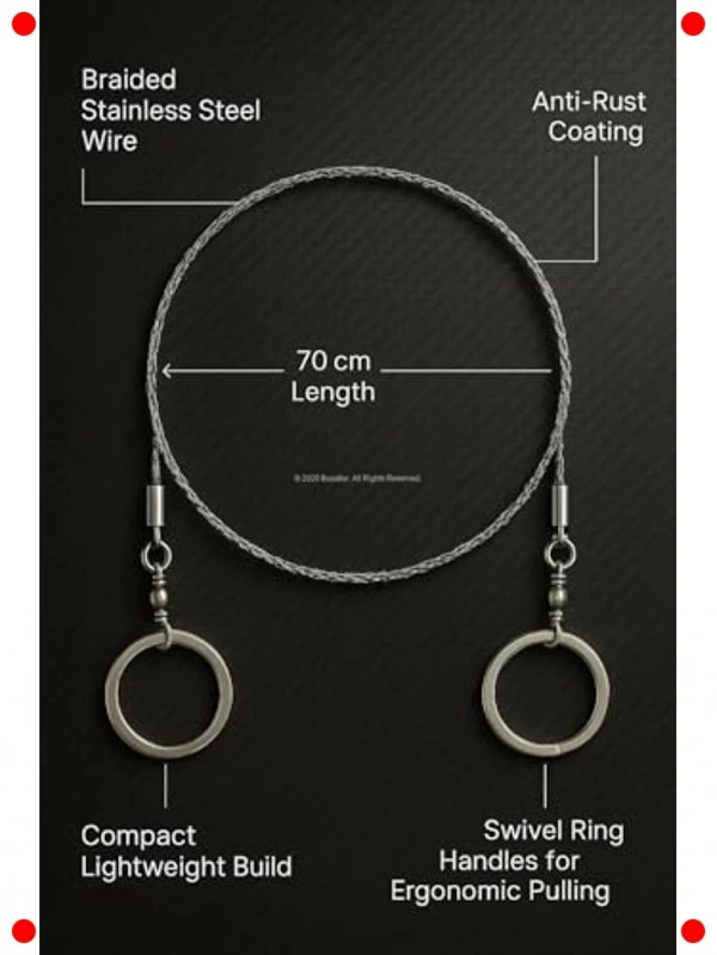 Doğa tutkunları, kampçılar ve acil durum hazırlıkçıları için özel olarak tasarlanmış bu taşınabilir çelik tel testere, kompakt boyutu ve üstün performansıyla vazgeçilmez bir araçtır. 70 cm uzunluğundaki paslanmaz çelik tel, yüksek dayanıklılığı sayesinde odun, plastik ve kemik gibi çeşitli malzemeleri kolayca kesmenizi sağlar. Sadece avuç içine sığacak kadar küçük ve hafiftir, bu sayede çantanızda veya cebinizde rahatlıkla taşıyabilirsiniz. Kamp, doğa yürüyüşü, hayatta kalma durumları ve acil kesme ihtiyaçları için mükemmeldir. İki ucundaki halkalı tutacaklar, kesme işlemini daha kontrollü ve konforlu hale getirir. Paslanmaz yapısı sayesinde dış mekan koşullarına karşı dirençlidir ve uzun ömürlü kullanım sunar. Yüksek mukavemetli yapısı ile zorlu görevlerde bile güvenle kullanılabilir. Bu pratik el aletiyle hazırlıklı olun.