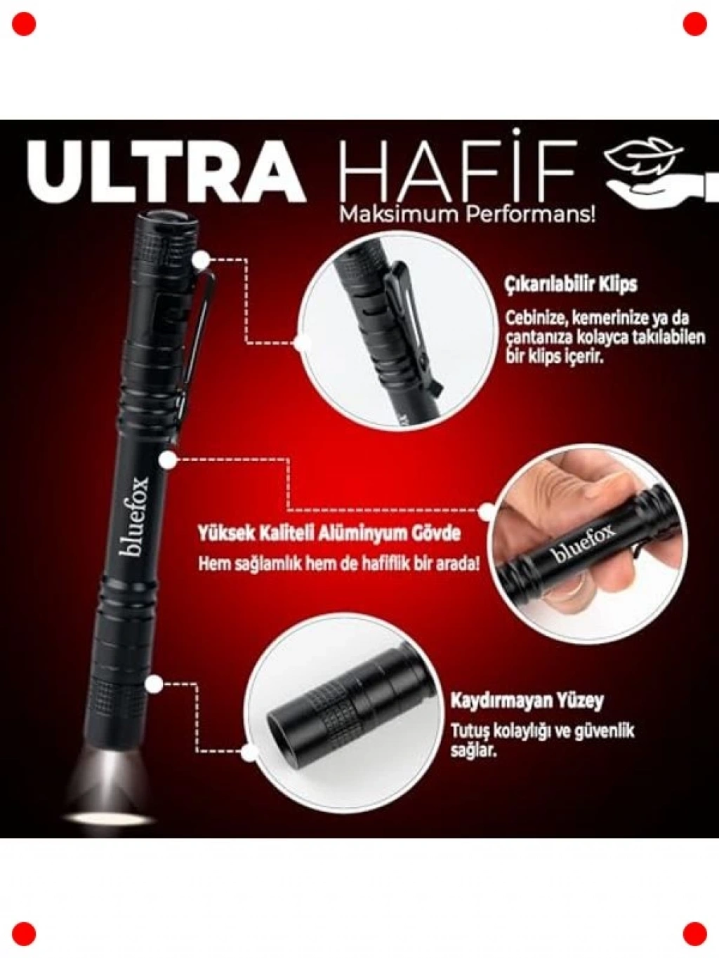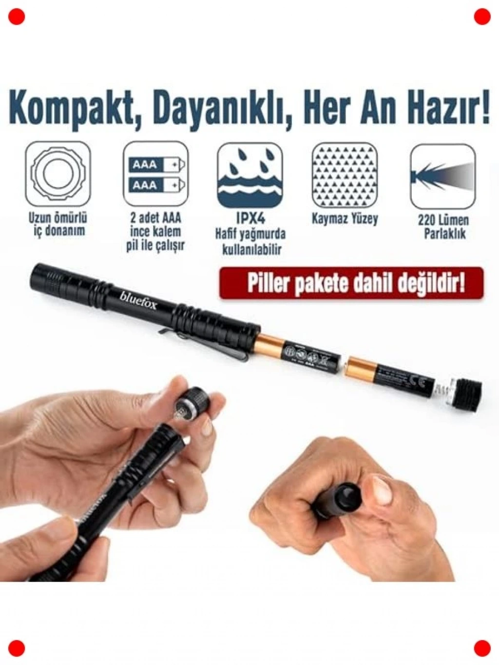 Her zaman yanınızda taşıyabileceğiniz kompakt ve güçlü bir aydınlatma çözümü olan bu LED kalem feneri, 220 lümen parlaklığıyla karanlık ortamları aydınlatır. Dayanıklı alüminyum gövdesi, düşmelere ve darbelere karşı dirençlidir. Su geçirmez özelliği sayesinde yağmurda veya nemli ortamlarda bile güvenle kullanılabilir. Kullanışlı klipsi sayesinde cebinize, çantanıza veya kemerinize kolayca takılabilir. Araç bakımı, kamp, balıkçılık, yürüyüş, acil durumlar veya günlük kullanım için idealdir. Hafif ve ergonomik tasarımı, uzun süreli kullanımlarda bile rahatlık sağlar.
