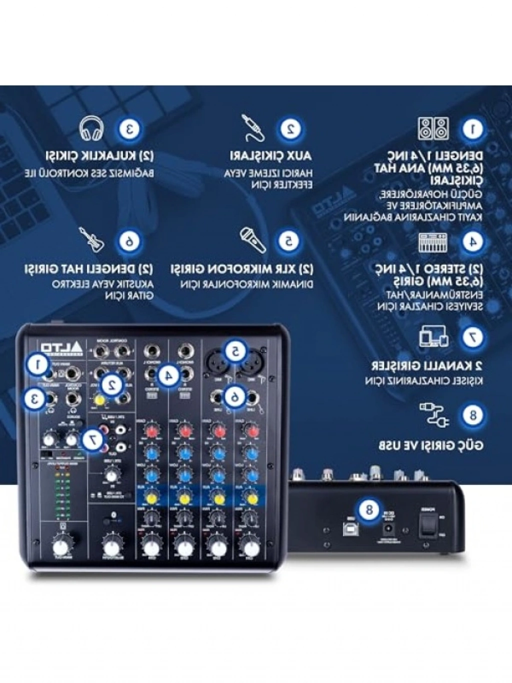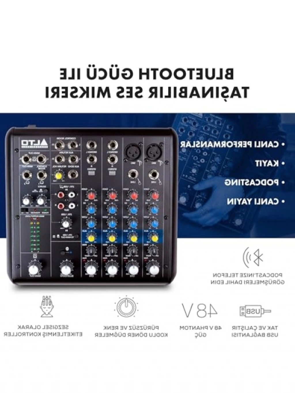 Bu profesyonel ses mikseri, 2 XLR mikrofon girişi, USB ses arayüzü ve Bluetooth bağlantısı ile donatılmıştır. Müzisyenler ve podcast yayıncıları için mükemmel bir seçimdir. Kullanımı kolay tasarımı sayesinde hızlı bağlantılar yaparak, canlı performanslarınızı ve kayıtlarınızı zahmetsizce gerçekleştirmenizi sağlar. Ayrıca, çeşitli giriş ve çıkış seçenekleri ile geniş bir kullanım alanı sunar. Sesinizi dilediğiniz gibi şekillendirin ve müzik projelerinizi profesyonel bir seviyeye taşıyın!