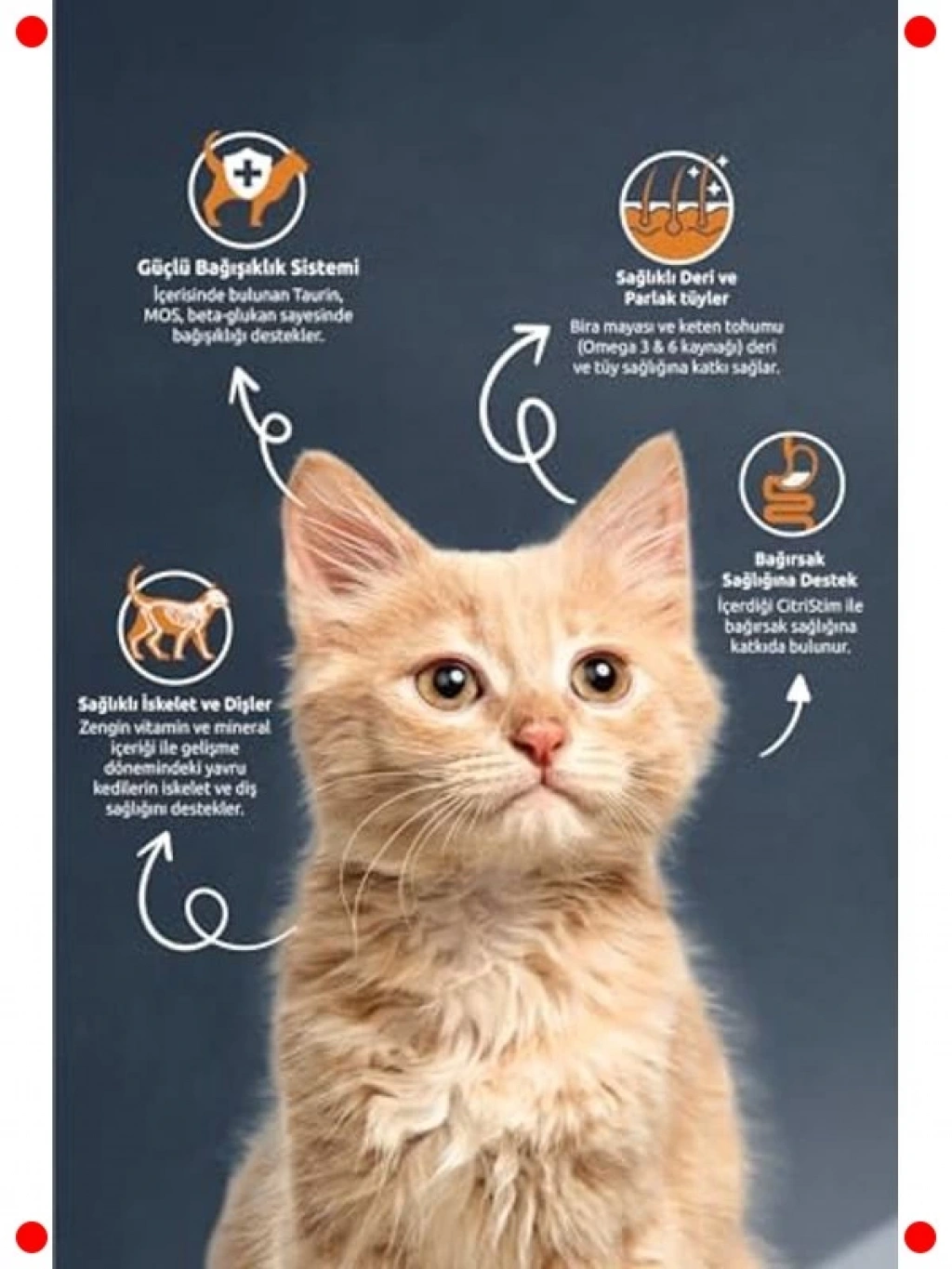 Yavru kedinizin sağlıklı büyüme ve gelişim sürecini desteklemek üzere özel olarak formüle edilmiş bu mama, yüksek kaliteli tavuk eti proteini içerir. Hızlı büyüme dönemindeki enerji ihtiyacını karşılamak için dengeli besin değerleri sunar. İçeriğindeki vitaminler, mineraller ve antioksidanlar, yavru kedinizin güçlü bir bağışıklık sistemi geliştirmesine yardımcı olur. Kemik ve diş gelişimini destekleyen kalsiyum ve fosfor dengesi, sağlıklı bir başlangıç için kritik öneme sahiptir. Küçük taneli yapısı, yavru kedilerin kolayca çiğnemesini ve sindirmesini sağlar. 2 kg'lık paketiyle yavru kedinizin ilk ayları için ideal bir beslenme çözümü sunar.
