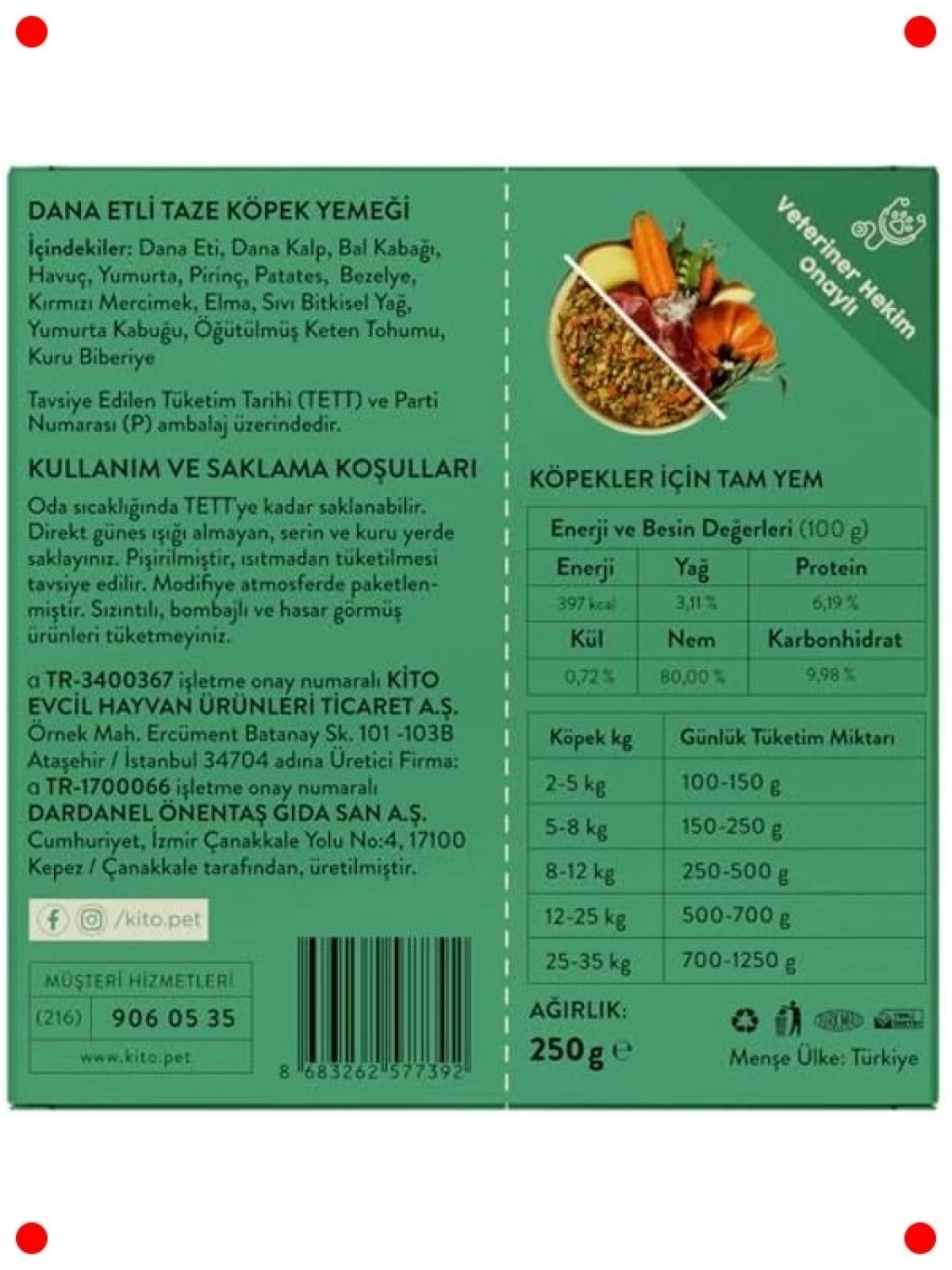 Köpeğiniz için taze ve besleyici bir öğün alternatifi sunan bu dana etli yemek, yüksek kaliteli protein içeriğiyle kas gelişimini destekler. Tamamen doğal malzemelerle hazırlanmış olup, köpeğinizin enerji ihtiyacını karşılamak üzere dengelenmiştir. Taze etin eşsiz lezzeti sayesinde en seçici köpeklerin bile iştahını açar. Mama veya ek besin olarak kullanılabilir, öğünlerine çeşitlilik katar. İçeriğindeki besin maddeleri köpeğinizin genel sağlığını, bağışıklık sistemini ve canlılığını destekler. 250 gramlık pratik ambalajı, tazeliği koruyarak her öğünde lezzetli bir deneyim sunar.