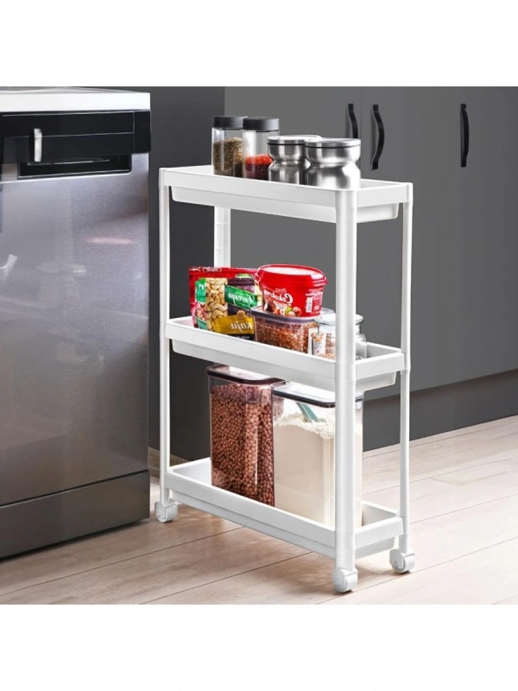 Bu yer tasarruflu raf ünitesi, sadece 18 cm genişliği ile dar alanlar için idealdir. 3 katlı geniş hacmiyle mutfak, banyo veya kiler gibi alanlarda düzenleme yapmanıza yardımcı olur. Tekerlekli yapısı sayesinde kolayca hareket ettirilebilir ve montajı aletsiz olarak gerçekleştirilir. Dayanıklı plastik malzeme ile uzun ömürlü kullanım sunar.