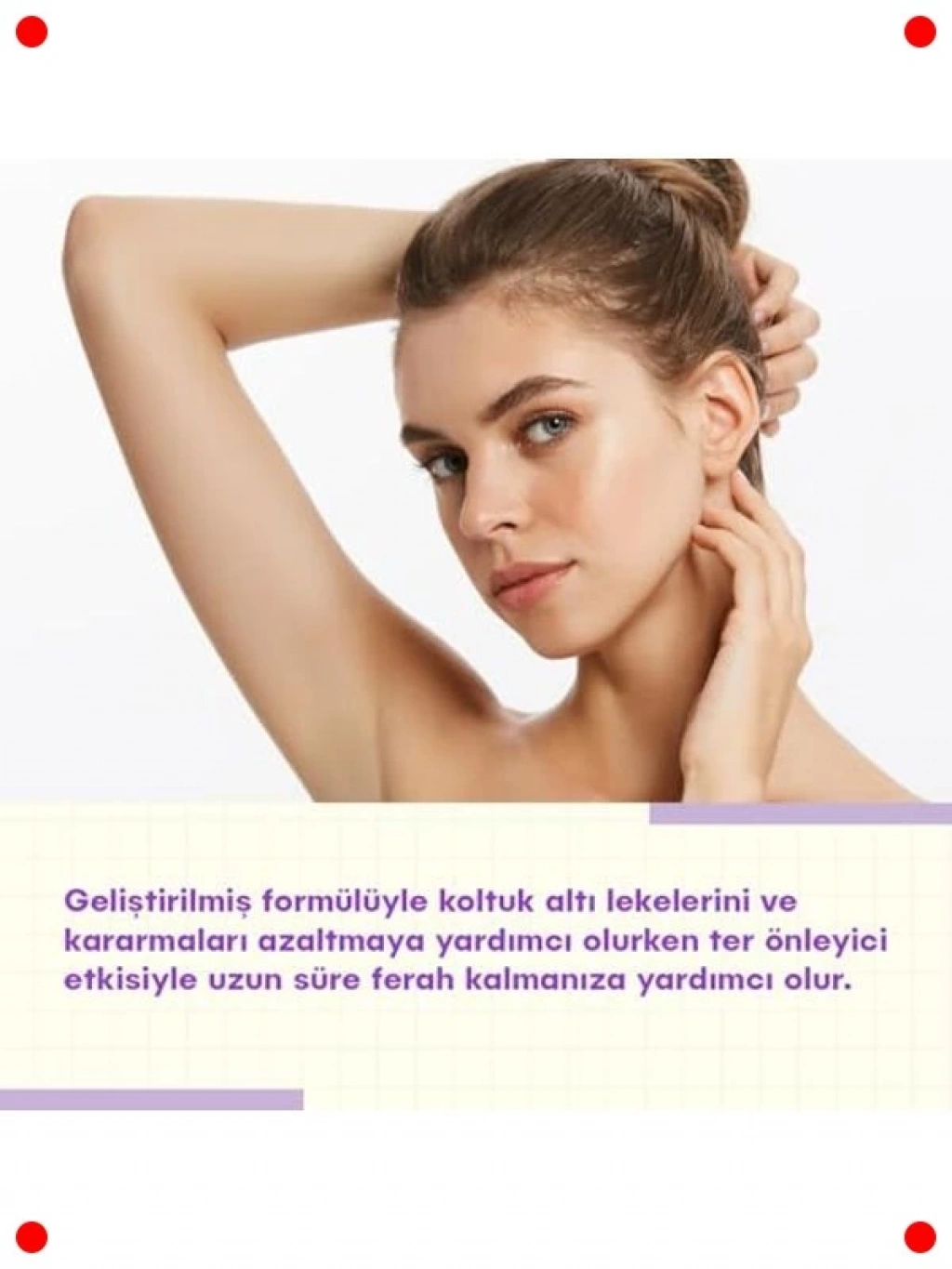 Gün boyu süren ferahlık ve güven için özel olarak formüle edilmiş bu terleme önleyici roll-on, koltuk altı kararmalarına karşı beyazlatıcı etki sunar. Güçlü antiperspirant özelliği sayesinde terlemeyi ve kötü kokuyu etkili bir şekilde kontrol altına alır. Hızlı kuruyan ve iz bırakmayan yapısıyla kıyafetlerinizde beyaz leke veya sarı iz oluşumunu engeller. Cildinize nazik davranır ve hassas koltuk altı bölgesi için uygundur. Kendinizi her an temiz ve güvende hissetmenizi sağlar.