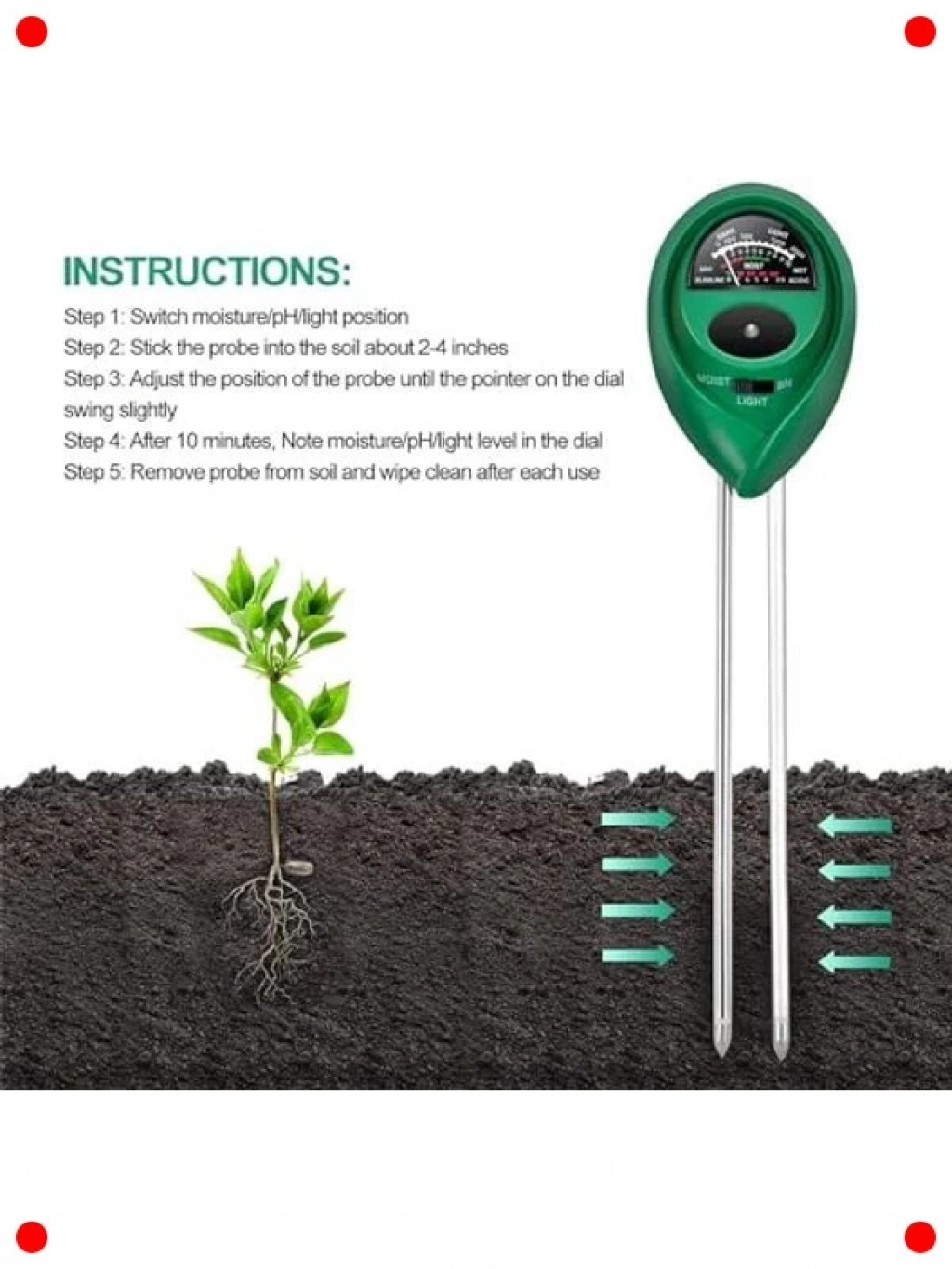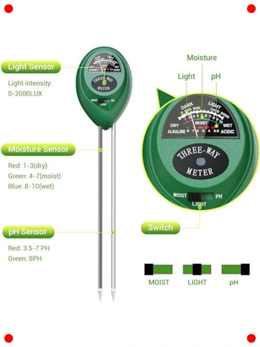 Bitkilerinizin gerçek ihtiyaçlarını öğrenin! Bu pratik 3'ü 1 arada toprak ölçer ile toprağın nem seviyesini, pH değerini ve ışık yoğunluğunu anında belirleyebilirsiniz. Batarya veya güç kaynağına ihtiyaç duymadan, sadece probu toprağa batırarak doğru sonuçlara ulaşın. Aşırı sulamayı önleyerek kök çürümesini engelleyebilir, doğru pH seviyesi ile besin emilimini optimize edebilir ve ideal ışık koşullarını sağlayarak bitkilerinizin en sağlıklı şekilde büyümesini destekleyebilirsiniz. Hem iç hem de dış mekan bitkileri için vazgeçilmez bir araçtır.