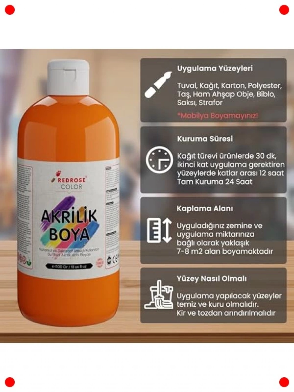 Sanat projelerinize sıcaklık ve enerji katacak bu canlı turuncu akrilik boya ile yaratıcılığınızı serbest bırakın. 500 gramlık büyük boyutu, uzun süreli kullanım ve geniş projeler için idealdir. Yüksek pigmentasyonlu formülü sayesinde, tek katta bile yoğun ve parlak bir renk sunar. Hızlı kuruma özelliği, katmanlı çalışmalar yaparken size zaman kazandırır. Tuval, ahşap, kağıt ve diğer birçok yüzeyde rahatlıkla kullanılabilir. Profesyonel sanatçılardan hobi amaçlı kullanıcılara kadar herkes için uygundur. Karıştırması kolay yapısıyla farklı tonlar elde etmenizi sağlar.