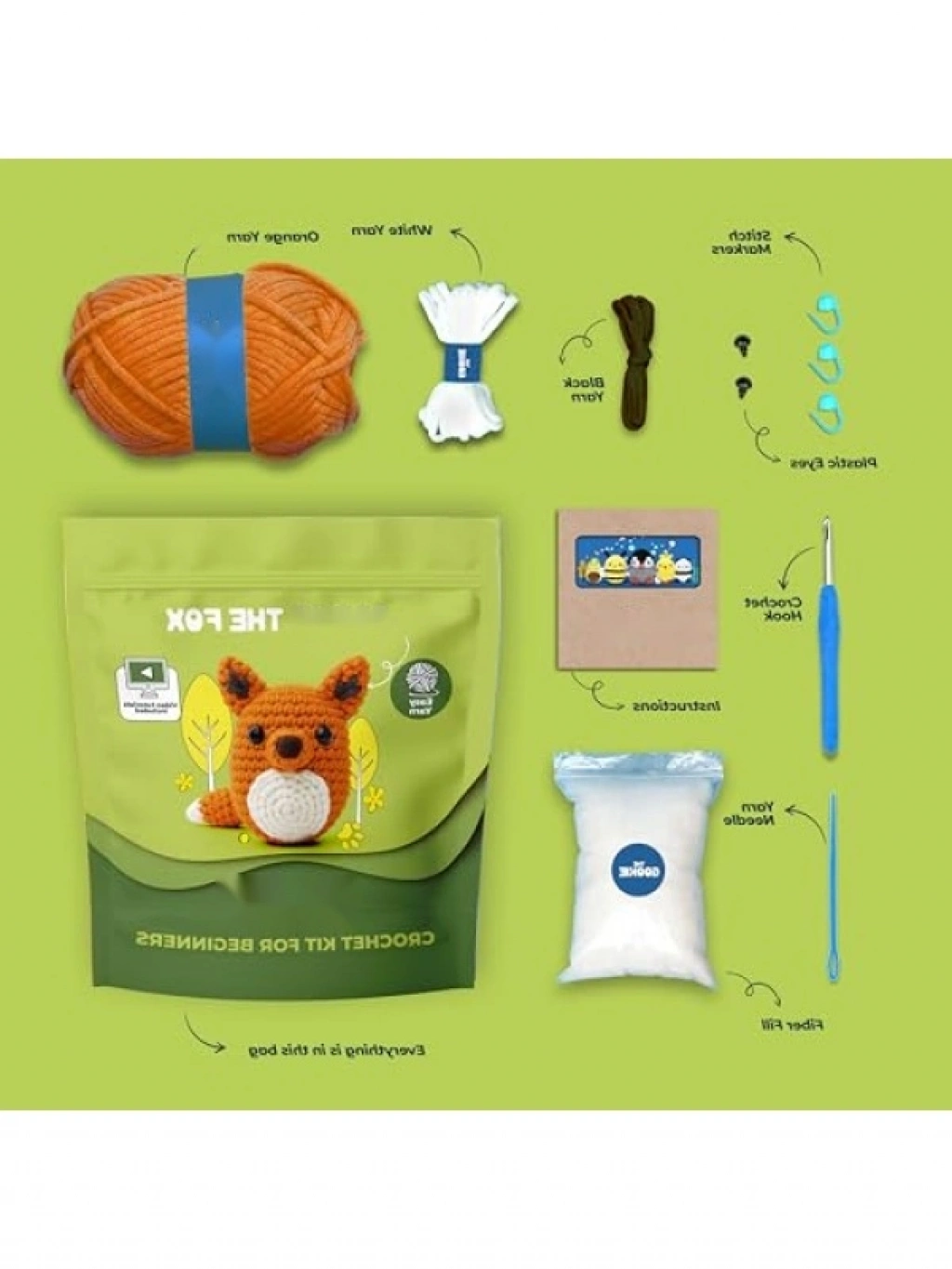 Başlangıç seviyesindeki örgü severler için tasarlanmış bu set, detaylı video eğitimi ve kolay takip edilebilir talimatlar içerir. Set, turuncu, beyaz ve siyah iplik, tığ, iğne, plastik gözler ve dolgu elyafı gibi malzemelerle birlikte gelir. Tamamlandığında yaklaşık 15 cm boyutunda sevimli bir tilki karakteri oluşturur. Yumuşak dokulu özel iplikler ile uzun ömürlü ve dayanıklı bir proje sunar.