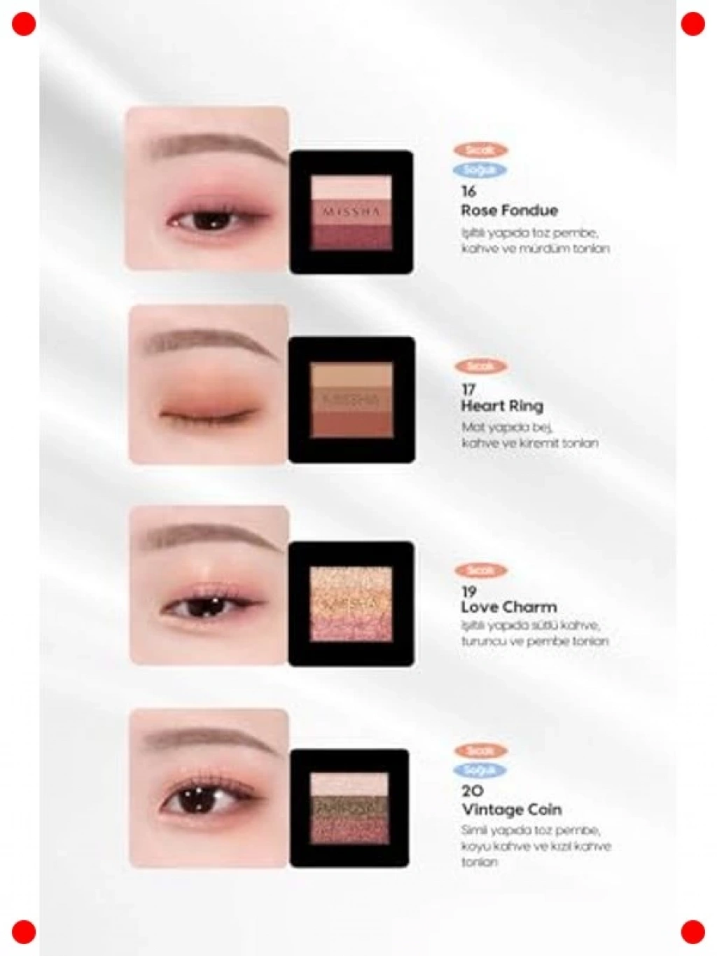 Üçlü Göz Farı Paleti, Marsala Kırmızı Tonları ile gözlerinize çarpıcı ve sofistike bir dokunuş katmak için tasarlanmıştır. Yumuşak ve ipeksi dokuya sahip bu üçlü far, kolayca uygulanır ve dağılır, dökülme yapmayan özel formülü sayesinde gün boyu kalıcılık sağlar. Palet içerisindeki renkler birbiriyle mükemmel uyum sağlayarak, doğal gündüz makyajından dramatik akşam makyajına kadar çeşitli görünümler yaratmanıza olanak tanır. Yüksek pigmentasyonu sayesinde tek sürüşte canlı renkler sunar. Gözlerinizi ön plana çıkaracak ve bakışlarınıza derinlik katacak bu palet, makyaj çantanızın vazgeçilmezi olacak.