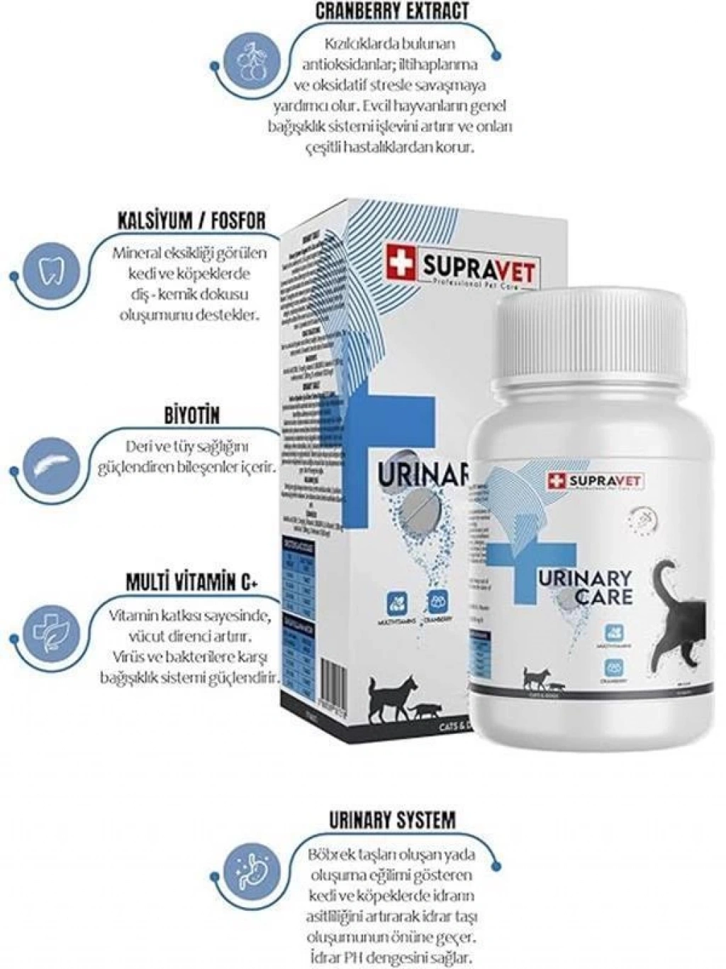 Bu ürün hakkında Urinary Care Kedi ve Köpek için İdrar Sağlığı Sistem Destekleyici Tablet ( 75 Tablet )Kedi ve Köpekler için Üriner Sistem Desteği(75 Tablet)İçerisinde bulunan Kızılcık sayesinde akutveya kronik idrar yolu enfeksiyonlarının duyarlılığını azaltmayı amaçlayan destek ürünüdür Bakterilerin üriner sistemin mukoza zarlarına yapışmasına engel olur Kedi ve köpeklerin idrar yolunun normal işlevini desteklemeye ve korumaya yardımcı olur C vitamini virüs ve bakterilere karşı bağışıklık sistemini güçlendirir Aşırı sıcak enfeksiyon eklem rahatsızlıklarıalerji solunum yolu rahatsızlıkları gibi stres şartlarında destekleyici ve güçlendiricidir