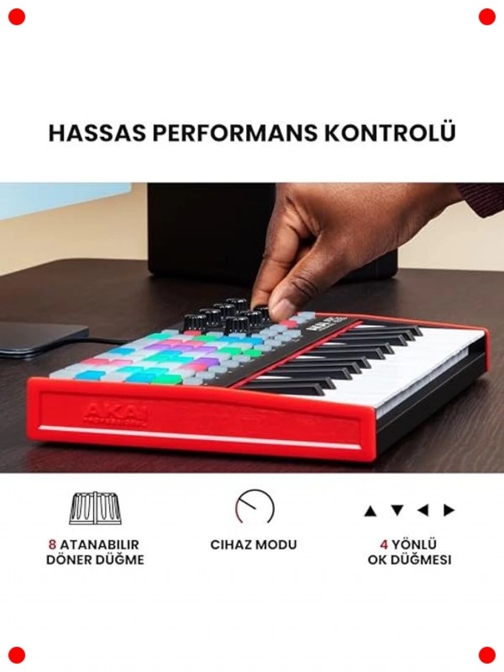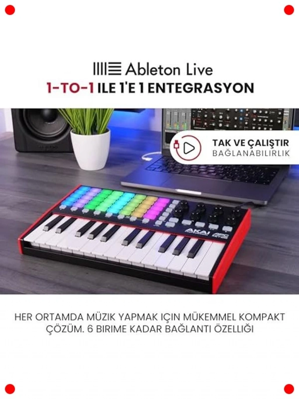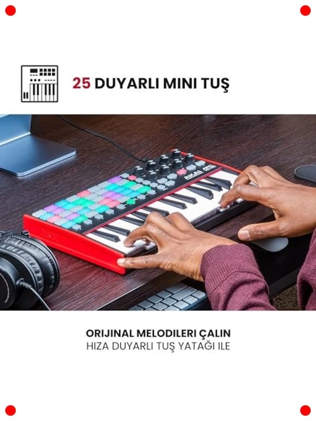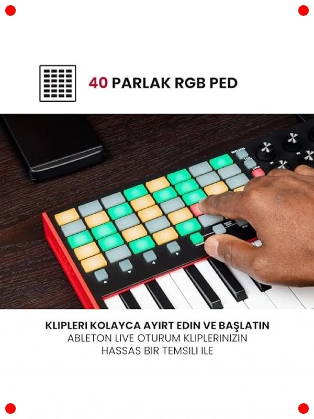 Müzik prodüksiyonu ve canlı performanslar için tasarlanmış bu kompakt USB MIDI klavye kontrolcü, yaratıcılığınızı serbest bırakmak için güçlü özellikler sunar. 37 adet hassas mini tuşu ve 40 adet dinamik RGB aydınlatmalı performans pedi ile melodileri çalabilir, davulları programlayabilir ve örnekleri tetikleyebilirsiniz. Klip başlatma ve parametre kontrolü için 8 adet atanabilir düğme, iş akışınızı hızlandırır ve sezgisel kontrol sağlar. Birlikte verilen müzik üretim yazılımıyla hemen prodüksiyona başlayabilirsiniz. Hem stüdyoda hem de sahnede esneklik ve sezgisel kontrol arayanlar için mükemmel bir çözümdür.