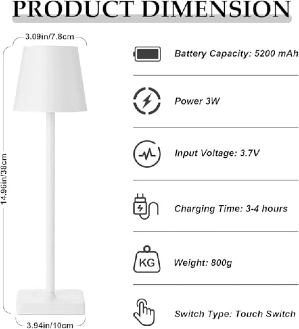USB şarjlı modern masa lambası, 38 cm yüksekliğiyle farklı yaşam alanlarına uyum sağlar. Yüksek kaliteli mühendislik PC malzemesi ile üretilmiş, %98 ışık geçirgenliği sunan lambanın yüzeyi elektrolizle kaplanmıştır. Dokunmatik ayar anahtarı ile ışık ve renk ayarları kolayca yapılabilir. Ev yemek masası, yatak odası, bar ve restoran gibi çeşitli ortamlar için uygundur.