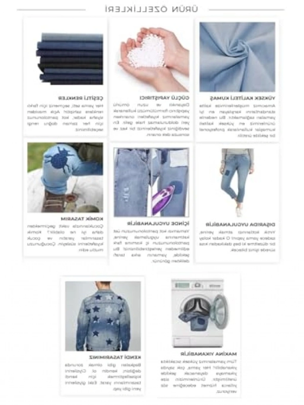 %100 pamuklu kumaştan üretilmiş olan bu yapışkan kot yamalar, dayanıklı yapısıyla kıyafetlerinizde uzun süreli kullanım sunar. Ütü yardımı ile sadece 25 saniyede uygulanabilen pratik tasarımı, dikiş zahmetine girmeden hızlı onarımlar yapmanıza olanak tanır. Dört farklı renk seçeneği ile her türlü denim kumaşa uyum sağlar. 30°C'de yıkanabilir ve daha fazla dayanıklılık isteyen kullanıcılar için dikişle sabitlenmeye de uygundur.