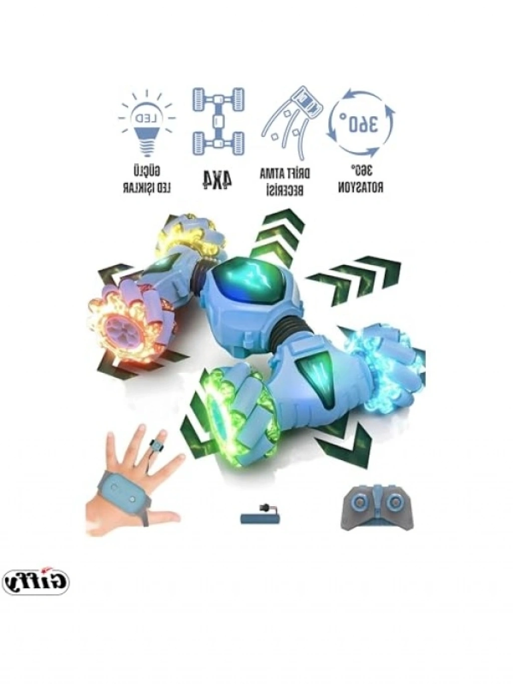 Bu şarjlı akrobat araba, hem bileklik hem de uzaktan kumanda ile kontrol edilebilir, böylece ebeveynler ve çocuklar birlikte eğlenceli anlar yaşayabilir. 2.4 GHz teknolojisi ile yüksek menzil ve kesintisiz kontrol sunar. Parlayan LED ışıklarıyla dikkat çeken bu araba, akrobatik hareketler yapabiliyor. 4 tekerlek üzerinde stabil bir şekilde hareket ederken, dayanıklı yapısıyla çocukların güvenle kullanabileceği bir üründür. Hızlı şarj özelliği sayesinde sürekli oynama keyfi sunar ve çocukların hayal gücünü geliştirir.
