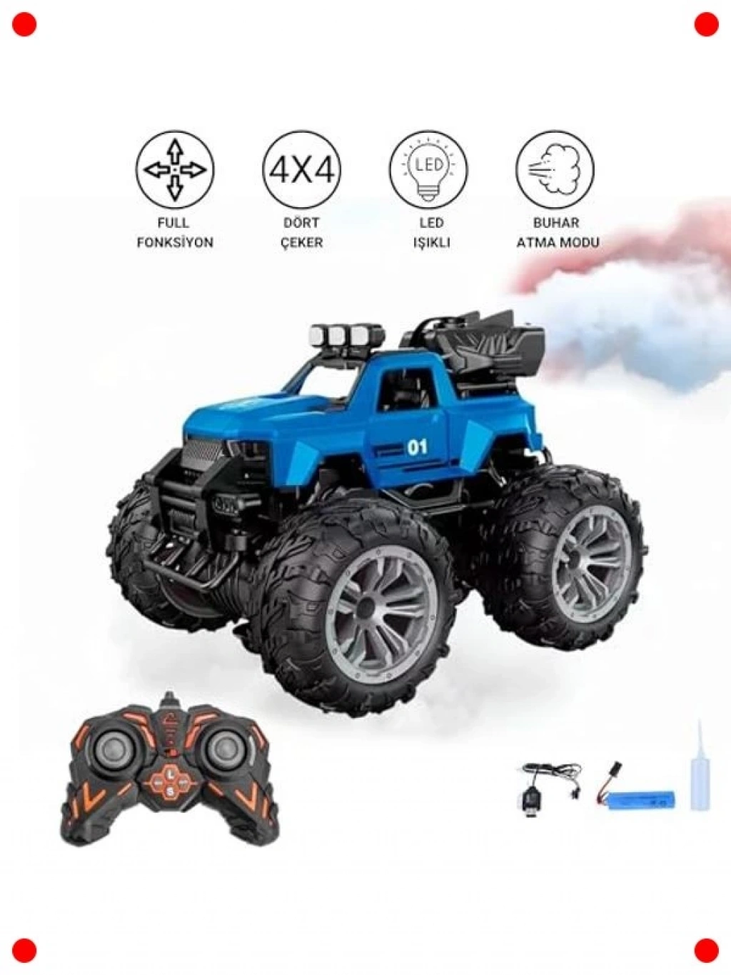Adrenalin tutkunları için tasarlanmış bu uzaktan kumandalı, 4x4 off-road araç ile macera dolu sürüşlere hazır olun! 15 km/s hıza ulaşabilen bu şarjlı araç, yüksek tekerlekleri ve 4 çeker özelliği sayesinde en zorlu arazilerin bile üstesinden gelir. Özel buhar veya duman atma fonksiyonu ile yarışlara daha fazla heyecan katarken, vites tuşları sayesinde kontrol tamamen sizde. Mavi, yeşil veya kırmızı renk seçenekleriyle sunulan bu dayanıklı model, çocukların koordinasyon ve stratejik düşünme becerilerini geliştirir. İç ve dış mekanda sınırsız eğlence vadeden bu araç, her yaştan RC tutkunu için harika bir hediye.
