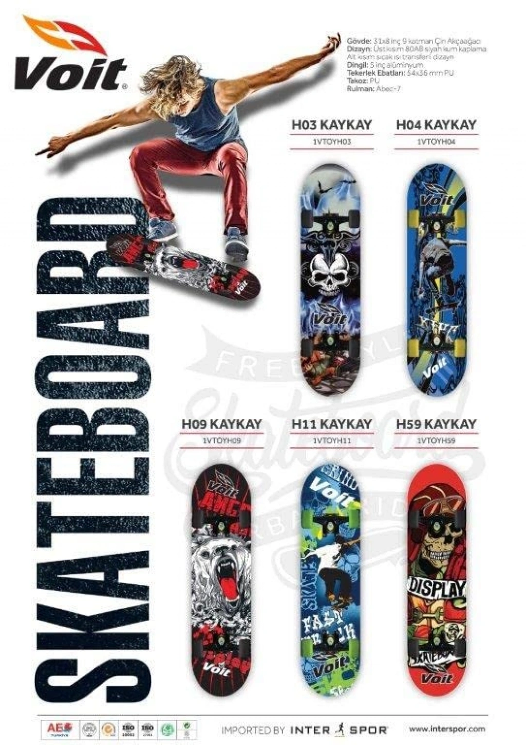 Voit H03 kaykay, 5 inç alüminyum dingili ve 54x36 mm PU silikon tekerlek ebatlarıyla dikkat çekiyor. ABEC-7 rulmanları sayesinde hızlı ve akıcı bir kayma deneyimi sunuyor. Hem yeni başlayanlar hem de deneyimli kaykay severler için uygun özelliklere sahip olan bu kaykay, dayanıklılığıyla uzun süreli kullanım için ideal bir seçimdir. Tekerleklerin yapısı, kayma esnasında konfor ve güvenlik sağlarken, alüminyum dingil hafifliği ile manevra kabiliyetinizi artırıyor.
