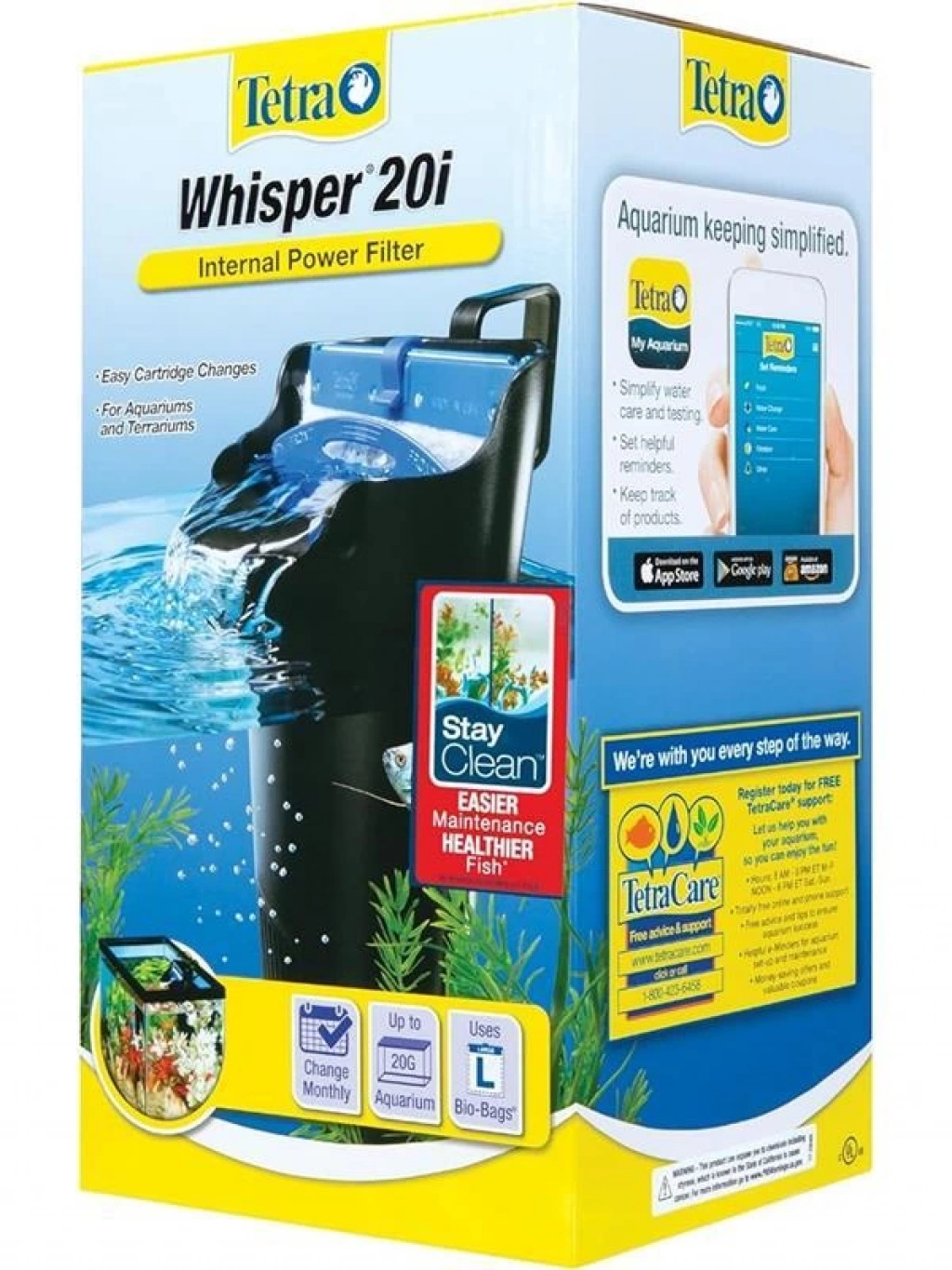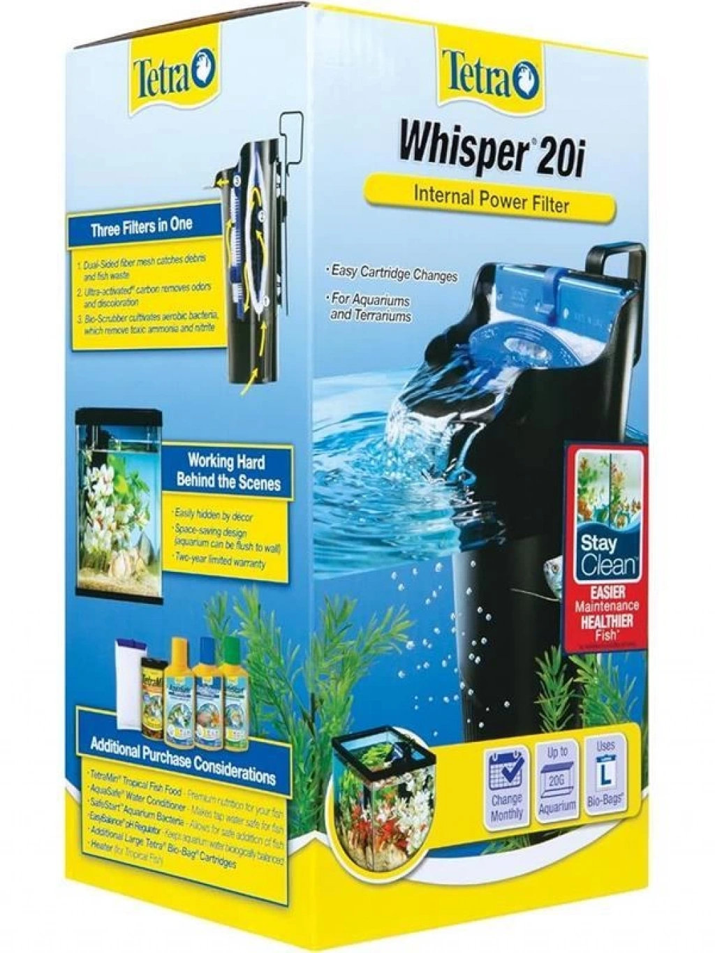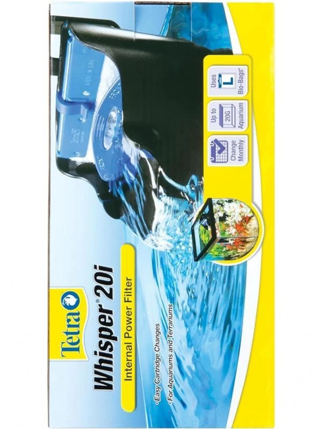 Evrensel tasarım Whisper 20i Dahili Filtre hepsi bir arada hava pompası ve su filtresi sistemidir İç filtre Akvaryumunuzun iç kısmına klips (dahil) ile monte edilir Pislikleri yakalar Yoğun çift taraflı ağ pislikleri ve balık dışkılarını filtreler Suyu havalandırır Hava tahrikli tasarım suyu havalandırırken 125 gphye kadar filtreler Kullanışlı tasarım Değiştirilmesi kolay orta boy BioBag kartuş filtre kullanır akvaryumun içine monte edilerek tankın duvara yaslanmasını mümkün kılar