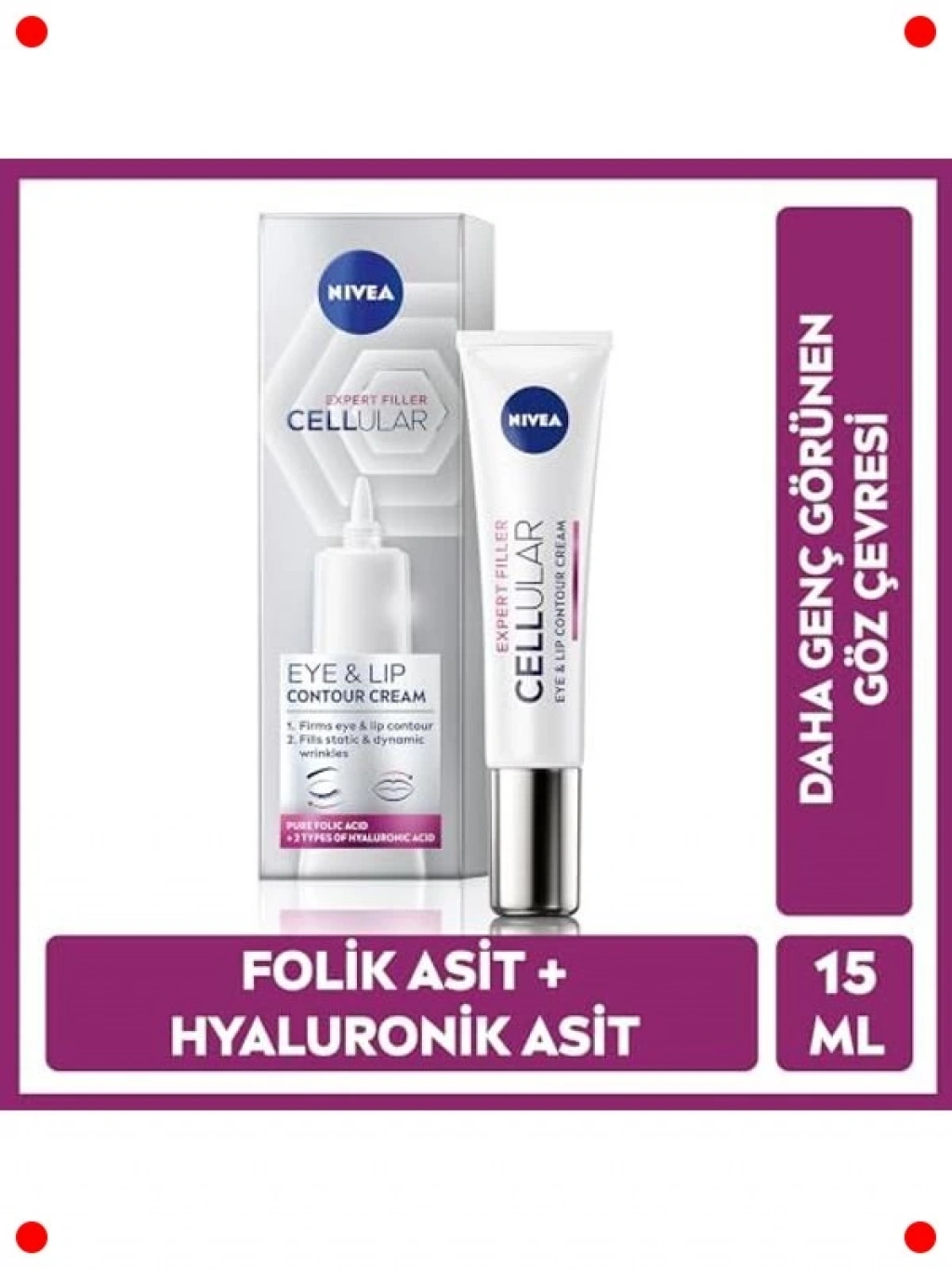Göz ve dudak çevresindeki hassas cilt bölgeleri için özel olarak tasarlanmış bu yaşlanma karşıtı krem, çizgi ve kırışıklık görünümünü azaltmaya yardımcı olur. Hyaluronik asit ve folik asit gibi güçlü bileşenlerle zenginleştirilmiş formülü, cildi derinlemesine nemlendirir ve elastikiyetini artırır. Göz altı morluklarının ve şişliklerinin azalmasına katkıda bulunurken, dudak çevresindeki ince çizgileri hedef alır. Cilde pürüzsüz ve daha genç bir görünüm kazandırır. Hafif dokusu sayesinde kolayca emilir ve hassas ciltler için uygun bir bakım sunar.