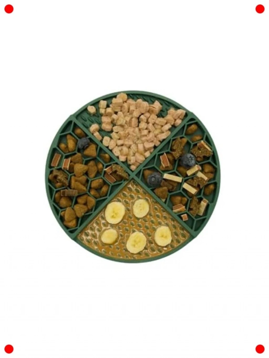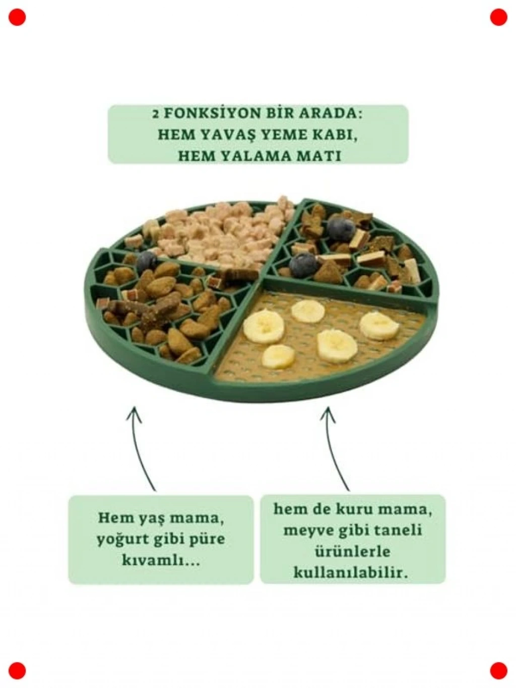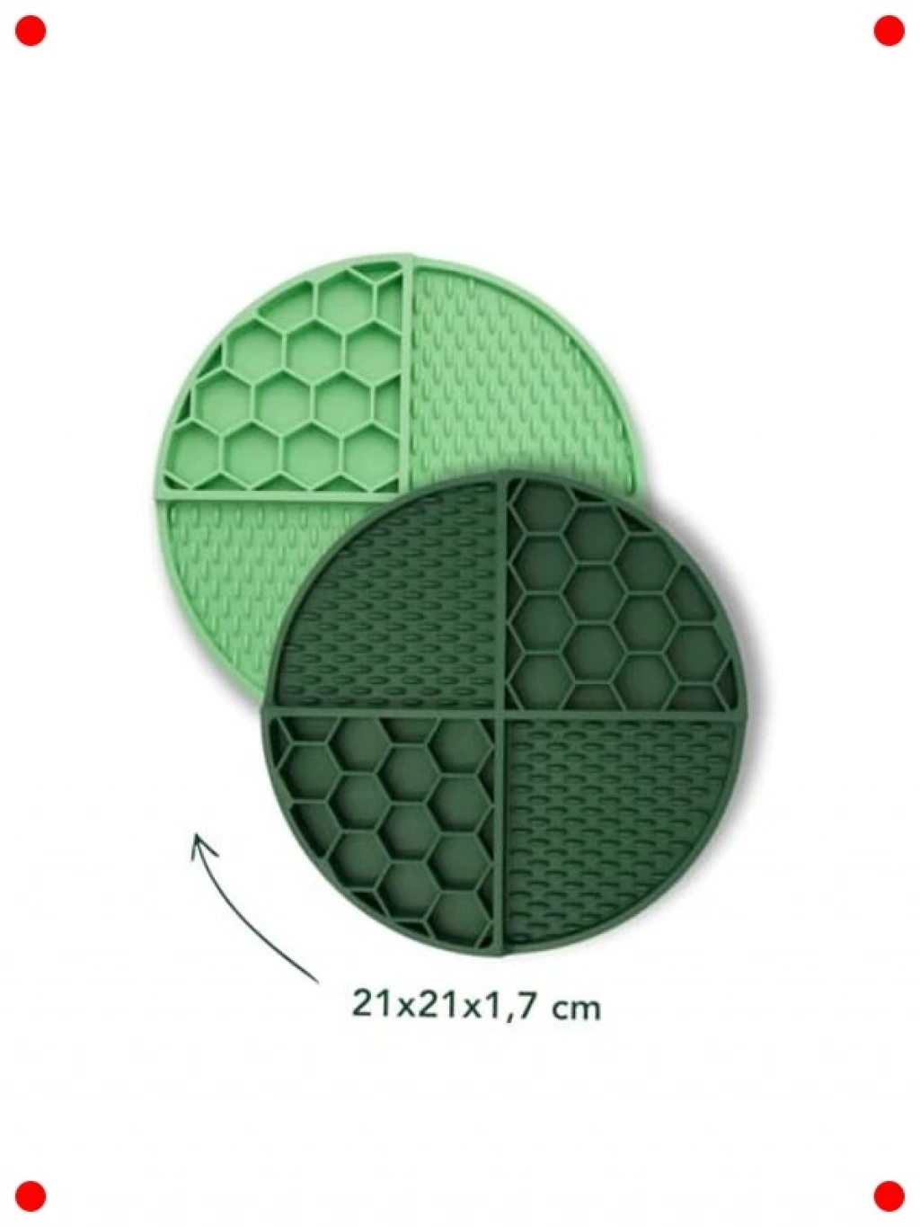 Evcil dostunuzun yemek yeme alışkanlığını yavaşlatmak ve anksiyeteyi azaltmak için tasarlanmış bu yalama matı, pratik bir çözümdür. Gıda sınıfı silikondan üretilmiş petek deseni, yaş mama, yoğurt veya fıstık ezmesi gibi sürülebilir ödülleri uzun süre mat üzerinde tutar. Bu sayede evcil hayvanınızın daha yavaş yemesini, sindirimini kolaylaştırmasını ve can sıkıntısını gidermesini sağlar. Yalama eylemi, endorfin salgılayarak stresi azaltır ve sakinleştirici bir etki yaratır. Güçlü vantuzları sayesinde düz yüzeylere kolayca yapışır ve yerinden kaymaz. Temizlemesi kolaydır ve orman yeşili rengiyle şık bir görünüm sunar.