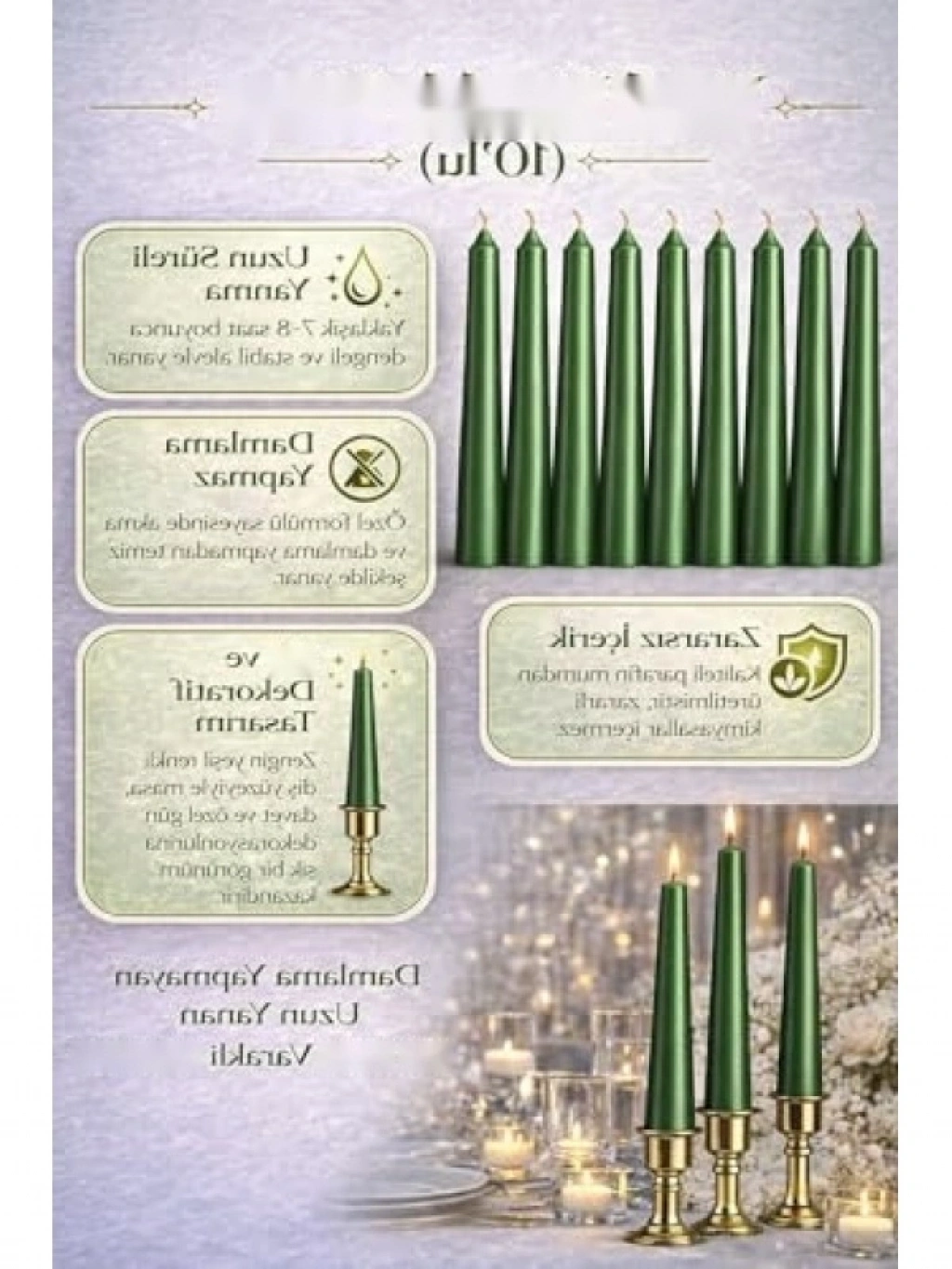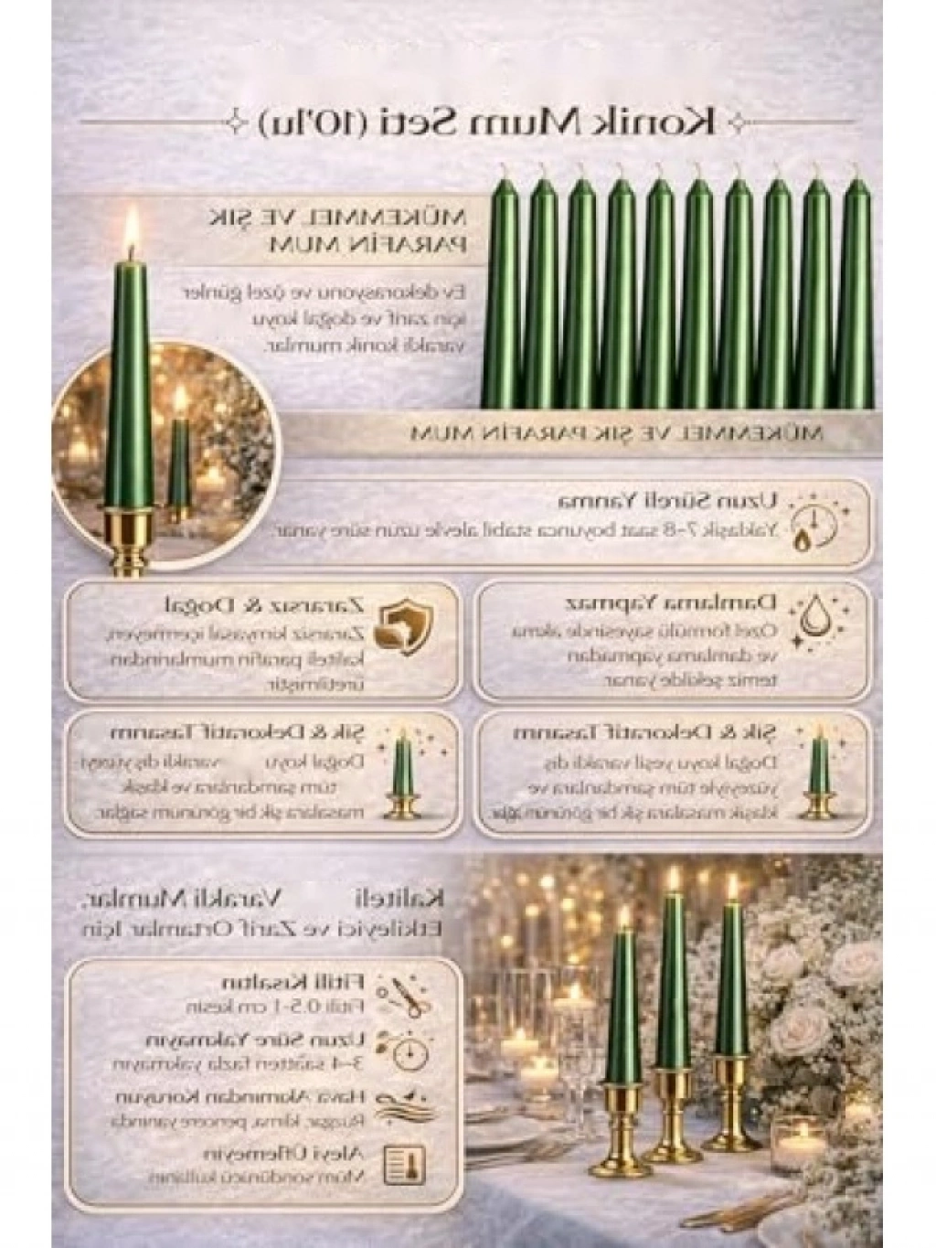 25 cm uzunluğundaki yeşil renkli ince şamdan mum seti, 10'lu paket olarak sunulmaktadır. Dilek mumları olarak da bilinen bu şık tasarım, masa düzenlemeleri ve özel günler için mükemmel bir dekoratif unsurdur. Parafin ve balmumundan üretilmiş kaliteli malzemesi ile uzun süreli yanma süresi sunar. Özel günlerde, davetlerde ve romantik akşam yemeklerinde atmosferi güzelleştirmek için ideal bir tercihtir.