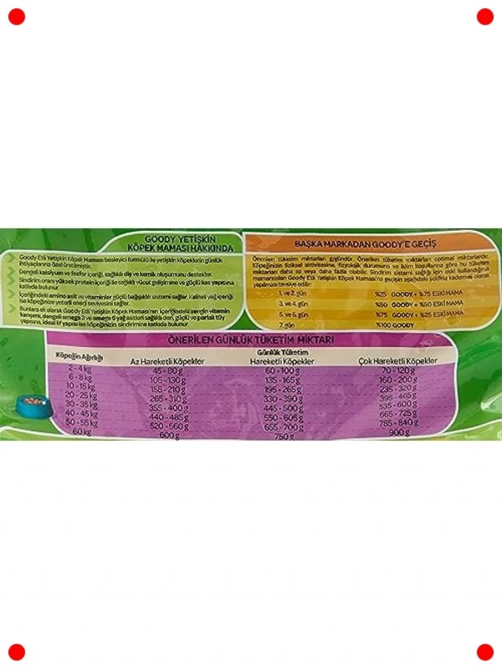Yetişkin köpeğinizin günlük beslenme ve bakım ihtiyaçlarını karşılamak üzere özel olarak formüle edilmiş bu mama, dengeli ve eksiksiz bir beslenme sunar. İçeriğindeki yüksek kaliteli proteinler, kas gelişimini ve bakımını desteklerken, optimal karbonhidrat dengesi köpeğinize gün boyu gerekli enerjiyi sağlar. Zengin vitamin ve mineral içeriği, bağışıklık sistemini güçlendirir ve genel sağlığını korumaya yardımcı olur. Aynı zamanda Omega 3 ve Omega 6 yağ asitleri sayesinde parlak tüylere ve sağlıklı bir cilde katkıda bulunur. Kolay sindirilebilir yapısı sayesinde hassas midelere sahip köpekler için de uygundur. 15 kg'lık büyük paketiyle uzun süreli ve ekonomik bir beslenme çözümü sunar, köpeğinizin her gün sağlıklı ve mutlu kalmasına destek olur.