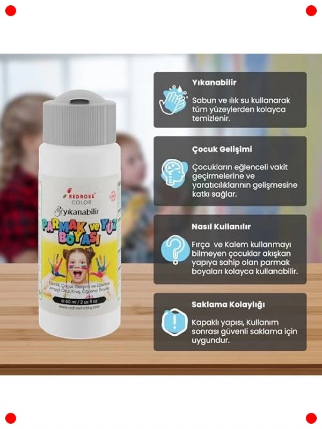 Minik sanatçıların ilk yaratıcı deneyimleri için ideal olan bu 60 ml'lik yıkanabilir beyaz parmak boyası ile eğlenceye hazır olun! Parlak beyaz rengi, çocukların tuval üzerinde hayal güçlerini özgürce kullanmalarına olanak tanır. Çocuk sağlığına uygun, toksik olmayan formülü sayesinde ebeveynler için de iç rahatlığı sunar. Cilt ve çoğu kumaştan kolayca yıkanabilir özelliği, olası dağınıklık endişesini ortadan kaldırır. Duyusal gelişimi, el-göz koordinasyonunu ve ince motor becerilerini destekler. Sanat projeleri ve duyusal oyunlar için mükemmel bir seçimdir.