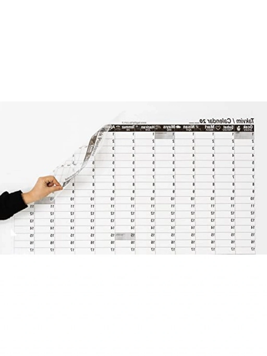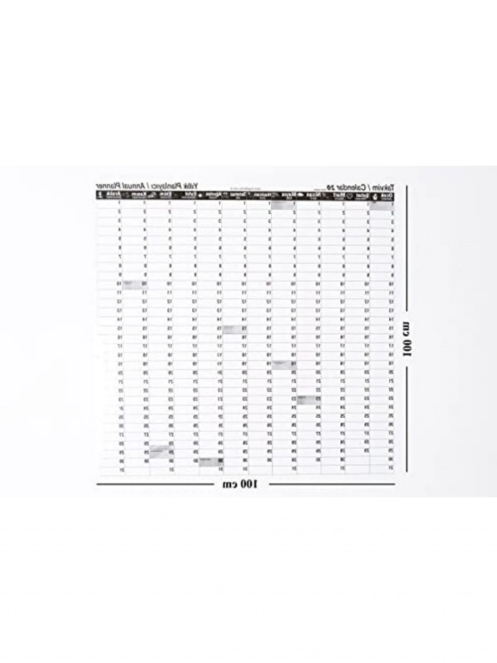 100 cm x 100 cm boyutlarındaki yıllık takvim, statik akıllı kağıt ile tasarlanmıştır. Yapışkan kullanmadan birçok yüzeye tutunabilen bu takvim, planlama ve organizasyon için idealdir. Yaz sil özelliği sayesinde notlarınızı kolayca güncelleyebilirsiniz.