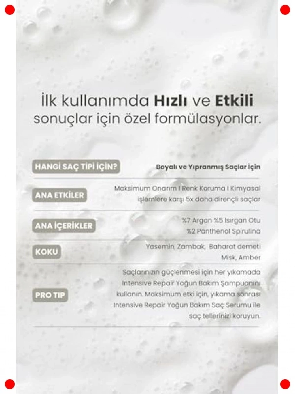 Yıpranmış ve zarar görmüş saçları onarmak için özel olarak formüle edilmiş bu şampuan, 100 ml'lik seyahat boyutuyla her yere yanınızda. Saç tellerini nazikçe temizlerken, içerdiği aktif bileşenlerle saçın doğal yapısını güçlendirir ve yeniden yapılandırır. Kırılmayı ve kopmaları azaltmaya yardımcı olurken, saçlara sağlıklı bir parlaklık ve yumuşaklık kazandırır. Düzenli kullanımda saçlarınızın daha güçlü, daha dirençli ve canlı görünmesine destek olur. Tatil, iş seyahati veya spor sonrası kullanım için idealdir.