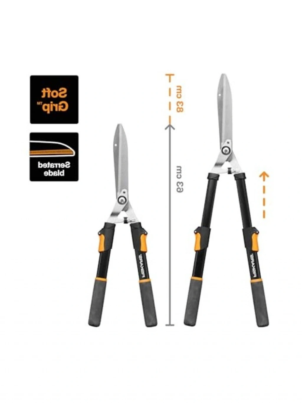 Teleskopik budama makinesi, 63-83 cm arasında ayarlanabilir uzunluğu ile çit ve çalıları zahmetsizce budamak için idealdir. Eklem dostu tasarımı ve hafif yapısı, kullanımı kolaylaştırırken, yüksek kaliteli çelik bıçakları kesim işlemlerini verimli hale getirir.